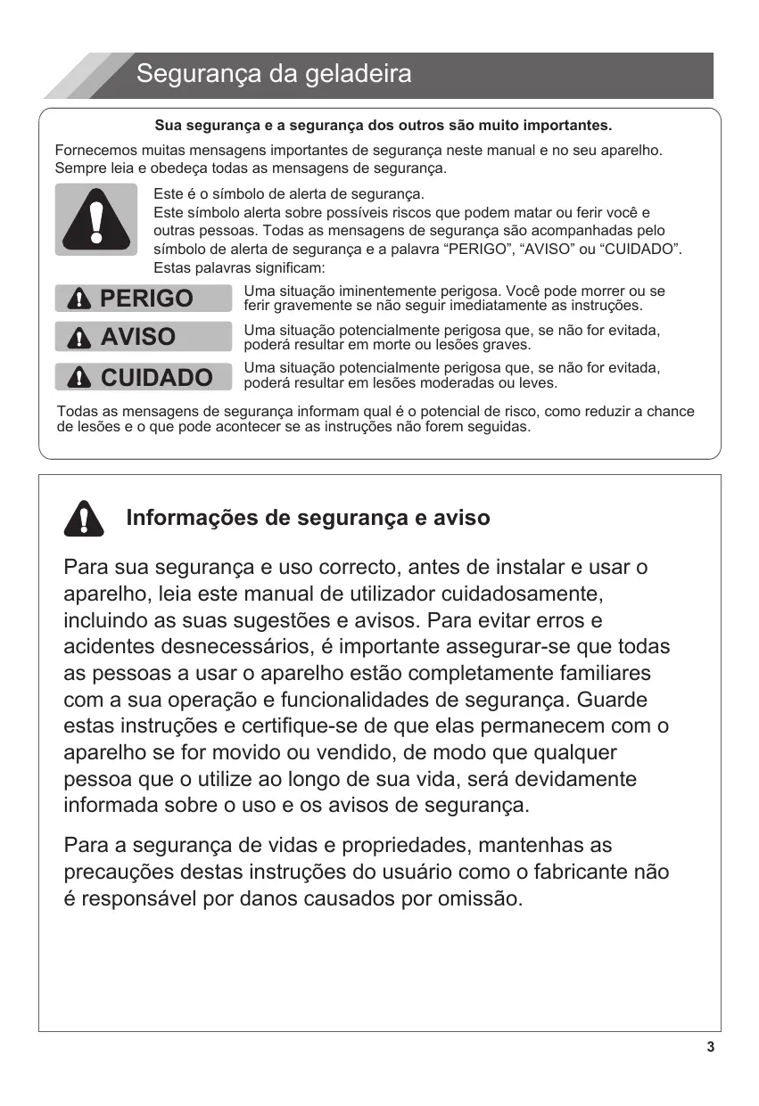 Segurança da geladeira Sua segurança e a segurança dos outros são muito importantes. Fornecemos muitas mensagens importantes de segurança neste manual e no seu aparelho. Sempre leia e obedeça todas as mensagens de segurança. Este é o símbolo de alerta de segurança. Este símbolo alerta sobre possíveis riscos que podem matar ou ferir você e outras pessoas. Todas as mensagens de segurança são acompanhadas pelo símbolo de alerta de segurança e a palavra “PERIGO”, “AVISO” ou “CUIDADO”. Estas palavras significam: