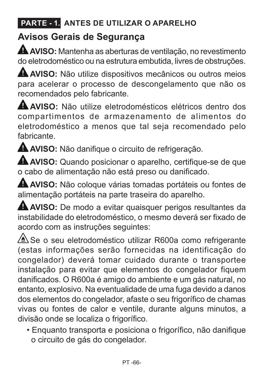 Avisos Gerais de Segurança À AVISO: Mantenha as aberturas de ventilaçäo, no revestimento do eletrodoméstico ou na estrutura embutida, livres de obstruçôes. ÂAaviso: Näo utilize dispositivos mecânicos ou outros meios para acelerar o processo de descongelamento que näo os recomendados pelo fabricante. Aaviso: Näo utilize eletrodomésticos elétricos dentro dos compartimentos de armazenamento de alimentos do eletrodoméstico a menos que tal seja recomendado pelo fabricante. ÂAaviso: Näo danifique o circuito de refrigeraçäo. ÂAaviso: Quando posicionar o aparelho, certifique-se de que o cabo de alimentaçäo näo est4 preso ou danificado. ÂAaviso: Näo coloque värias tomadas portäteis ou fontes de alimentaçäo portâteis na parte traseira do aparelho. ÂAaviso: De modo a evitar quaisquer perigos resultantes da instabilidade do eletrodoméstico, o mesmo dever ser fixado de acordo com as instruçôües seguintes: UNS o seu eletrodoméstico utilizar R600aà como refrigerante (estas informaçôes seräo fornecidas na identificaçäo do congelador) deverä tomar cuidado durante o transportee instalaçäo para evitar que elementos do congelador fiquem danificados. O R600a é amigo do ambiente e um gâs natural, no entanto, explosivo. Na eventualidade de uma fuga devido a danos dos elementos do congelador, afaste o seu frigorifico de chamas vivas ou fontes de calor e ventile, durante alguns minutos, a divisäo onde se localiza o frigorifico. + Enquanto transporta e posiciona o frigorifico, näo danifique o circuito de gäâs do congelador. PT -66-