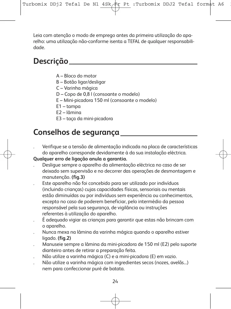 . Ne manipulez jamais le couteau du pied mixeur lorsque l’appareil est branché. (fig.2) . Manipulez toujours le couteau du mini-hachoir 150 ml (E2) par son support avant d’enlever votre préparation. . Ne pas faire fonctionner le pied mixeur (C) et le mini-hachoir (E) à vide. . Ne pas faire fonctionner votre pied mixeur avec des ingrédients secs ( noix, noisettes...), ni pour réaliser une purée de pommes de terre.
