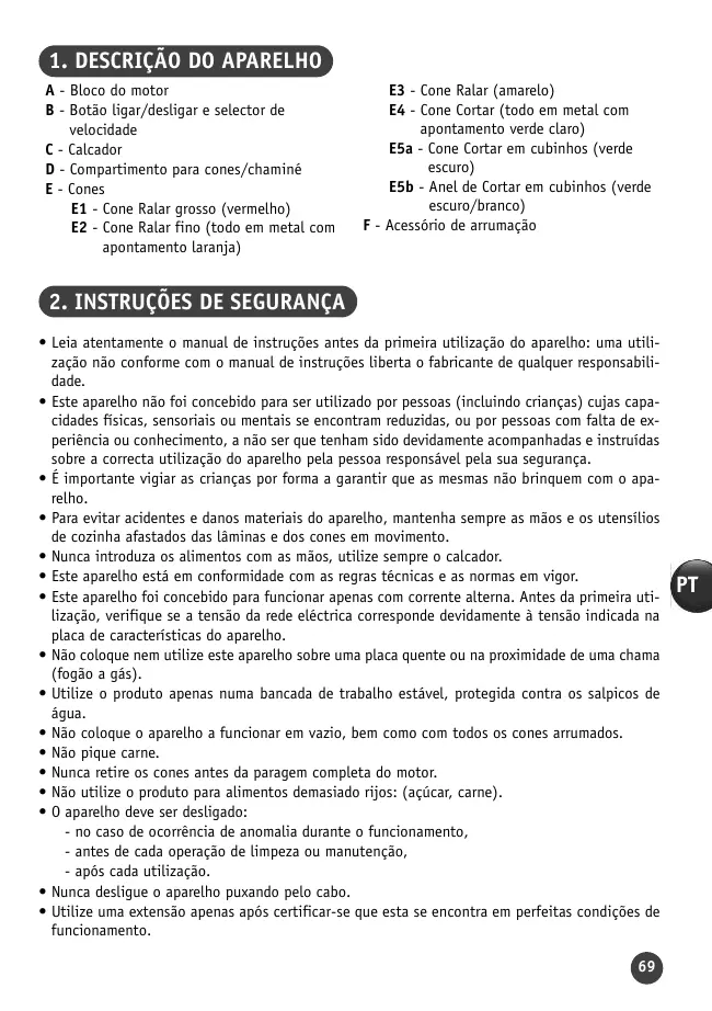 • Il convient de surveiller les enfants pour s’assurer qu’ils ne jouent pas avec l’appareil. • Pour éviter les accidents et les dégâts matériels de l’appareil, toujours garder les mains et les ustensiles de cuisine à l’écart des lames et des cônes en mouvement. • Ne jamais introduire les aliments avec les mains, toujours utiliser le poussoir. • Cet appareil est conforme aux règles techniques et aux normes en vigueur. • Il est conçu pour fonctionner uniquement en courant alternatif. Nous vous demandons avant la première utilisation de vérifier que la tension du réseau correspond bien à celle indiquée sur la plaque signalétique de l’appareil. • Ne pas poser, ni utiliser cet appareil sur une plaque chaude ou à proximité d’une flamme (cuisinière à gaz). • N’utiliser le produit que sur un plan de travail stable à l’abri des projections d’eau. • Ne pas faire fonctionner l’appareil à vide ainsi qu’avec tous les cônes rangés. • Ne pas hacher de viande. • Ne jamais retirer les cônes avant l’arrêt complet du moteur. • Ne pas utiliser le produit pour des aliments trop consistants : (sucre, viande). • L’appareil doit être débranché : - s’il y a une anomalie pendant le fonctionnement, - avant chaque nettoyage ou entretien, - après chaque utilisation. • Ne jamais débrancher l’appareil en tirant sur le cordon. • N’utiliser un prolongateur qu’après avoir vérifié que celui-ci est en parfait état. • Un appareil électroménager ne doit pas être utilisé : - s’il est tombé par terre, - si les cônes sont détériorés ou incomplets. 6