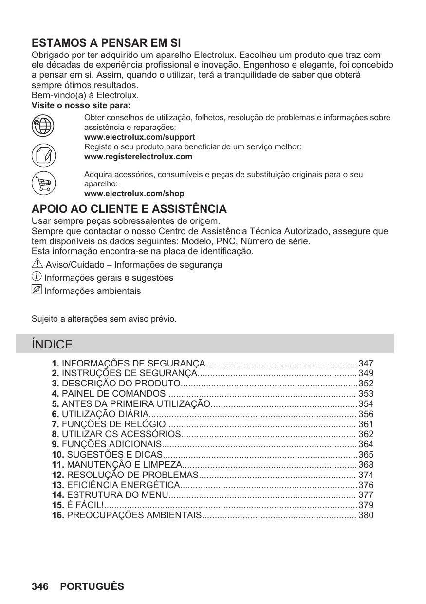 ÍNDICE 1. INFORMAÇÕES DE SEGURANÇA347 2. INSTRUÇÕES DE SEGURANÇA 349 3. DESCRIÇÃO DO PRODUTO352 4. PAINEL DE COMANDOS 353 5. ANTES DA PRIMEIRA UTILIZAÇÃO354 6. UTILIZAÇÃO DIÁRIA 356 7. FUNÇÕES DE RELÓGIO 361 8. UTILIZAR OS ACESSÓRIOS 362 9. FUNÇÕES ADICIONAIS 364 10. SUGESTÕES E DICAS365 11. MANUTENÇÃO E LIMPEZA 368 12. RESOLUÇÃO DE PROBLEMAS 374 13. EFICIÊNCIA ENERGÉTICA376 14. ESTRUTURA DO MENU 377 15. É FÁCIL!379 16. PREOCUPAÇÕES AMBIENTAIS 380