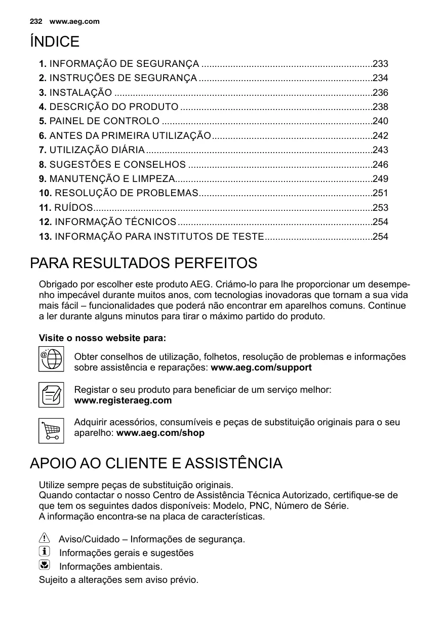 Obrigado por escolher este produto AEG. Criámo-lo para lhe proporcionar um desempenho impecável durante muitos anos, com tecnologias inovadoras que tornam a sua vida mais fácil – funcionalidades que poderá não encontrar em aparelhos comuns. Continue a ler durante alguns minutos para tirar o máximo partido do produto. Visite o nosso website para: Obter conselhos de utilização, folhetos, resolução de problemas e informações sobre assistência e reparações: www.aeg.com/support Registar o seu produto para beneficiar de um serviço melhor: www.registeraeg.com Adquirir acessórios, consumíveis e peças de substituição originais para o seu aparelho: www.aeg.com/shop