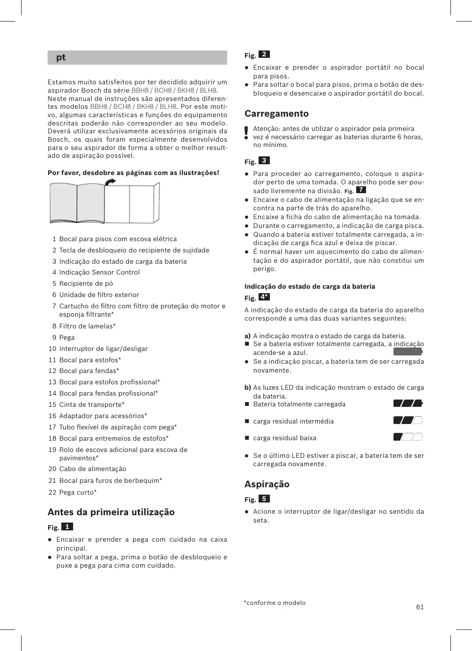 pt Estamos muito satisfeitos por ter decidido adquirir um aspirador Bosch da série BBH8 / BCH8 / BKH8 / BLH8. Neste manual de instruções são apresentados diferentes modelos BBH8 / BCH8 / BKH8 / BLH8. Por este motivo, algumas características e funções do equipamento descritas poderão não corresponder ao seu modelo. Deverá utilizar exclusivamente acessórios originais da Bosch, os quais foram especialmente desenvolvidos para o seu aspirador de forma a obter o melhor resultado de aspiração possível. Por favor, desdobre as páginas com as ilustrações!