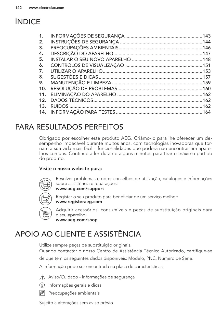 Obrigado por escolher este produto AEG. Criámo-lo para lhe oferecer um desempenho impecável durante muitos anos, com tecnologias inovadoras que tornam a sua vida mais fácil – funcionalidades que poderá não encontrar em aparelhos comuns. Continue a ler durante alguns minutos para tirar o máximo partido do produto. Visite o nosso website para: Resolver problemas e obter conselhos de utilização, catálogos e informações sobre assistência e reparações: www.aeg.com/support Registar o seu produto para beneficiar de um serviço melhor: www.registeraeg.com Adquirir acessórios, consumíveis e peças de substituição originais para o seu aparelho: www.aeg.com/shop