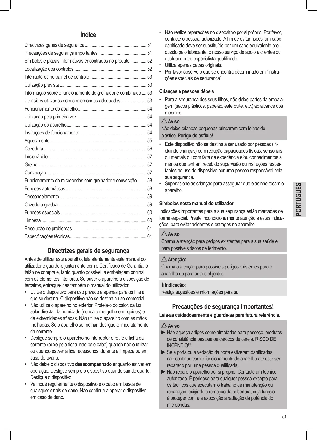 - Informação sobre o funcionamento do grelhador e combinado p. 53