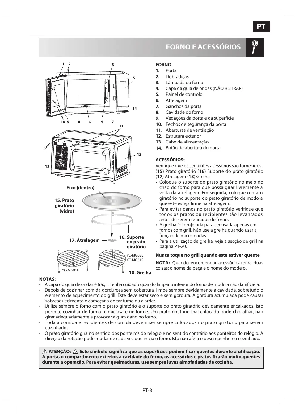 • Le boîtier du guide d'ondes est fragile. Veuillez faire très attention en nettoyant l’intérieur du four à ne pas l’ endommager. • Après la cuisson de nourriture grasse sans couvercle, nettoyez toujours la cavité et particulièrement l'élément gril de manière approfondie, ceux-ci devant être secs et exempts de graisse. La graisse accumulée peut chauffer et commencer à fumer voir s'enflammer. • Faites toujours fonctionner le four avec le plateau tournant et les pieds du plateau correctement installés. Cela favorise une cuisson régulière. Un plateau mal installé peut entraîner une mauvaise rotation et endommager le four. • Toute la nourriture et les récipients contenant de la nourriture doivent être placés sur le plateau tournant pour leur cuisson. • Le plateau tournant pivote dans le sens des aiguilles d’une montre ou dans le sens inverse. Le sens de la rotation peut changer à chaque utilisation du four. Ceci n’affecte pas les performances de cuisson. ATTENTION : Ce symbole indique que les surfaces peuvent devenir chaudes durant l'utilisation. La porte, le boîtier externe, la cavité du four, les accessoires et les plats deviennent très chauds durant le fonctionnement. Pour éviter toute brûlure, utilisez-toujours des gants de cuisine anti-chaleur épais de four.