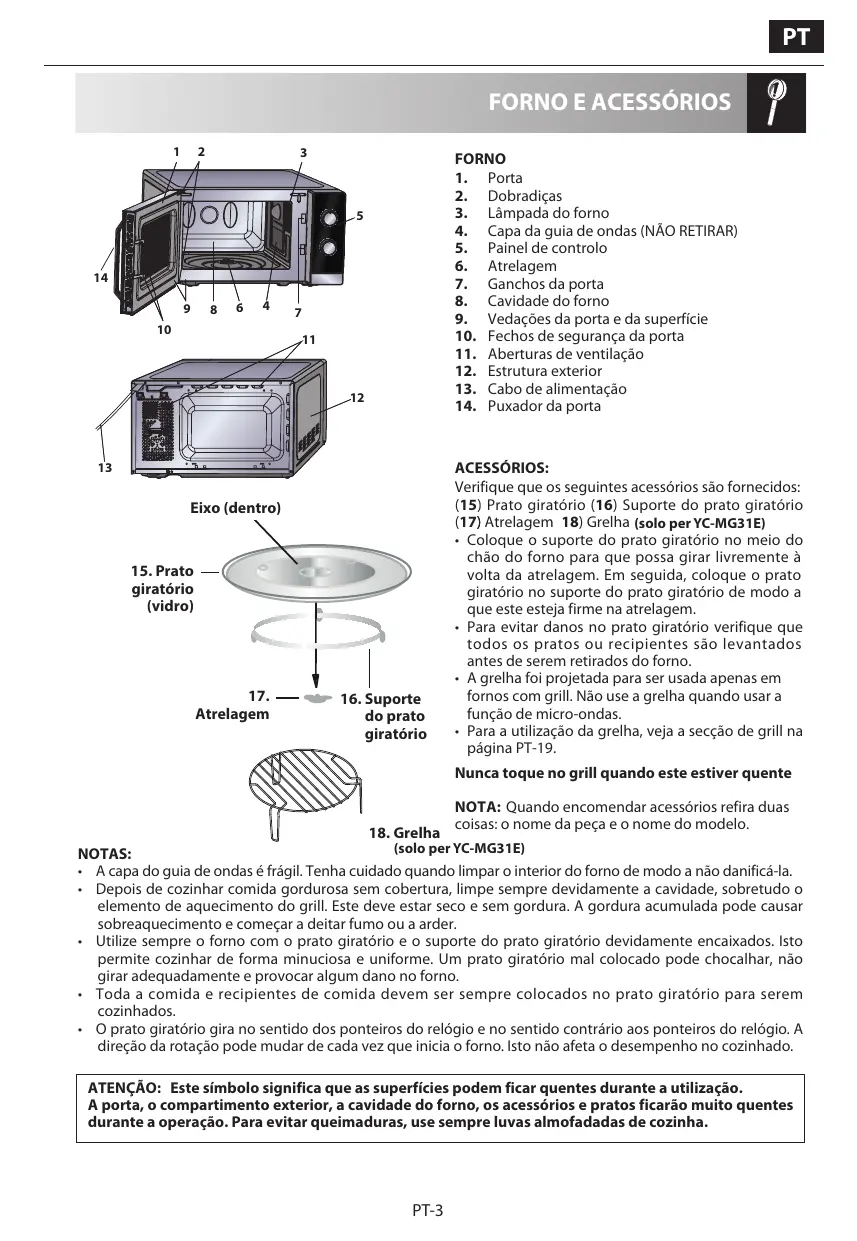 ACESSÓRIOS: Verifique que os seguintes acessórios são fornecidos: (15) Prato giratório (16) Suporte do prato giratório (17)) Atrelagem 18) Grelha (solo per YC-MG31E) • Coloque o suporte do prato giratório no meio do chão do forno para que possa girar livremente à volta da atrelagem. Em seguida, coloque o prato giratório no suporte do prato giratório de modo a que este esteja firme na atrelagem. • Para evitar danos no prato giratório verifique que todos os pratos ou recipientes são levantados antes de serem retirados do forno. • A grelha foi projetada para ser usada apenas em fornos com grill. Não use a grelha quando usar a função de micro-ondas. • Para a utilização da grelha, veja a secção de grill na página PT-19. Nunca toque no grill quando este estiver quente
