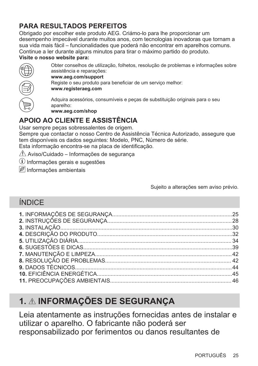 ÍNDICE 1. INFORMAÇÕES DE SEGURANÇA25 2. INSTRUÇÕES DE SEGURANÇA 28 3. INSTALAÇÃO30 4. DESCRIÇÃO DO PRODUTO32 5. UTILIZAÇÃO DIÁRIA 34 6. SUGESTÕES E DICAS39 7. MANUTENÇÃO E LIMPEZA 42 8. RESOLUÇÃO DE PROBLEMAS 42 9. DADOS TÉCNICOS 44 10. EFICIÊNCIA ENERGÉTICA45 11. PREOCUPAÇÕES AMBIENTAIS 46