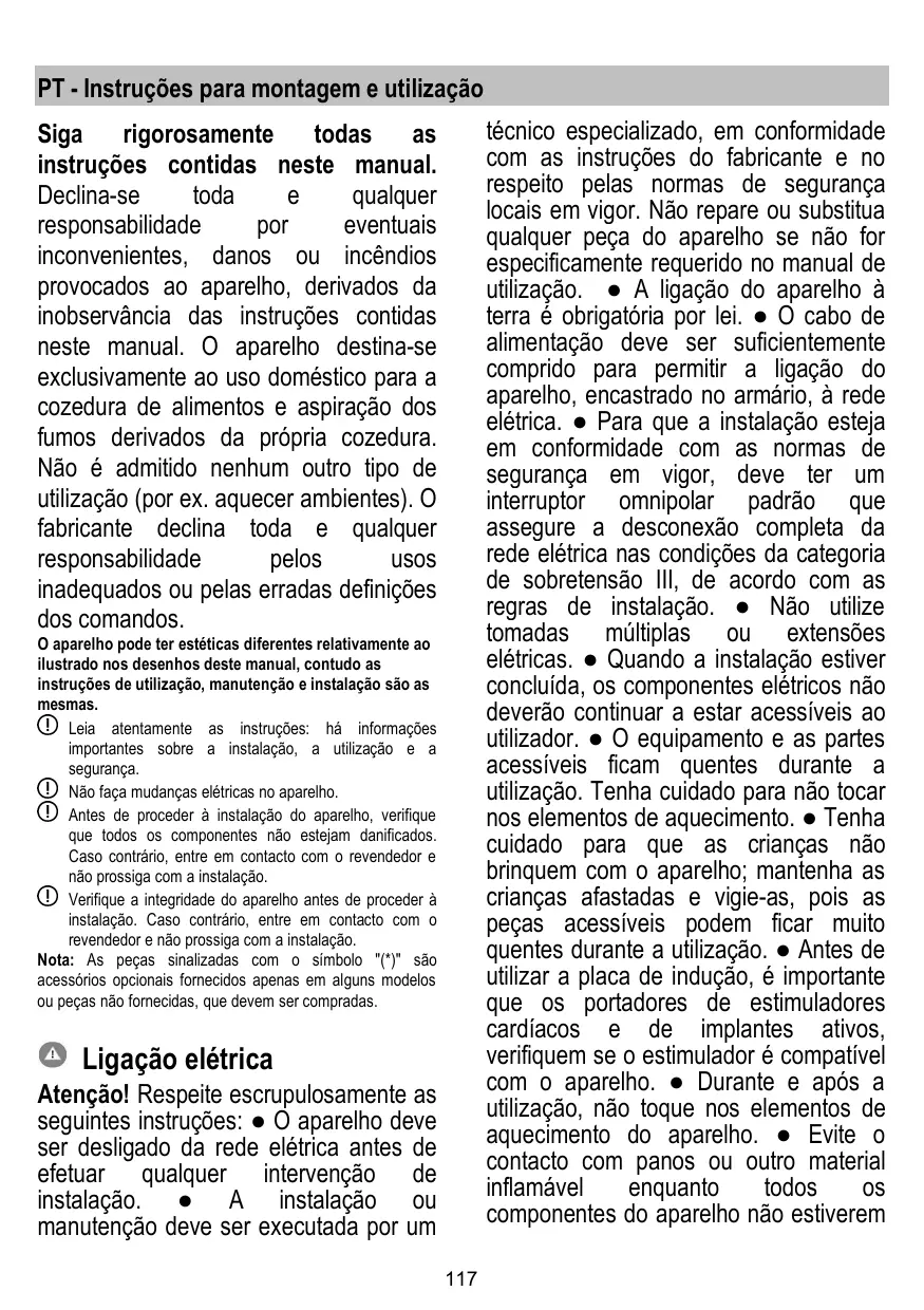 PT - Instruções para montagem e utilização técnico especializado, em conformidade com as instruções do fabricante e no respeito pelas normas de segurança locais em vigor. Não repare ou substitua qualquer peça do aparelho se não for especificamente requerido no manual de utilização. ● A ligação do aparelho à terra é obrigatória por lei. ● O cabo de alimentação deve ser suficientemente comprido para permitir a ligação do aparelho, encastrado no armário, à rede elétrica. ● Para que a instalação esteja em conformidade com as normas de segurança em vigor, deve ter um interruptor omnipolar padrão que assegure a desconexão completa da rede elétrica nas condições da categoria de sobretensão III, de acordo com as regras de instalação. ● Não utilize tomadas múltiplas ou extensões elétricas. ● Quando a instalação estiver concluída, os componentes elétricos não deverão continuar a estar acessíveis ao utilizador. ● O equipamento e as partes acessíveis ficam quentes durante a utilização. Tenha cuidado para não tocar nos elementos de aquecimento. ● Tenha cuidado para que as crianças não brinquem com o aparelho; mantenha as crianças afastadas e vigie-as, pois as peças acessíveis podem ficar muito quentes durante a utilização. ● Antes de utilizar a placa de indução, é importante que os portadores de estimuladores cardíacos e de implantes ativos, verifiquem se o estimulador é compatível com o aparelho. ● Durante e após a utilização, não toque nos elementos de aquecimento do aparelho. ● Evite o contacto com panos ou outro material inflamável enquanto todos os componentes do aparelho não estiverem