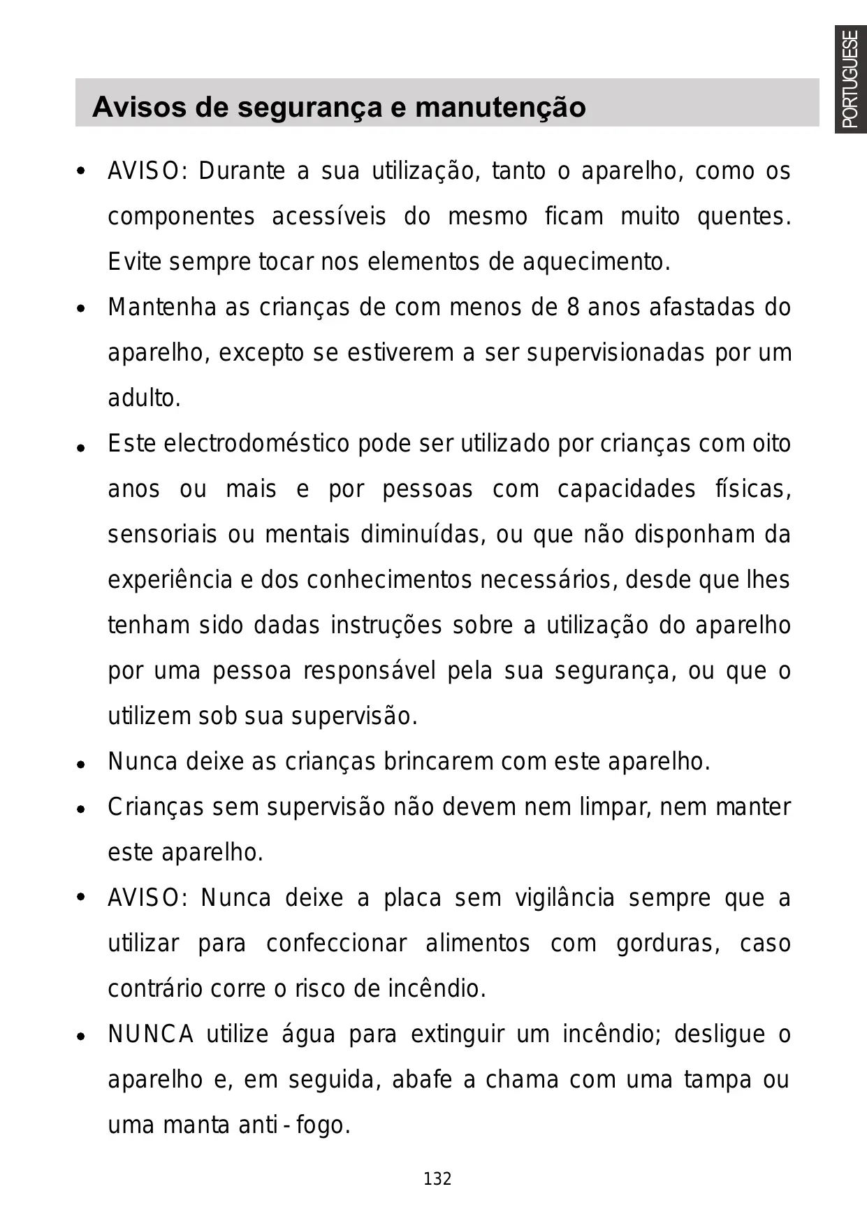 AVISO: Durante a sua utilização, tanto o aparelho, como os componentes acessíveis do mesmo ficam muito quentes. Evite sempre tocar nos elementos de aquecimento. Mantenha as crianças de com menos de 8 anos afastadas do aparelho, excepto se estiverem a ser supervisionadas por um adulto. Este electrodoméstico pode ser utilizado por crianças com oito anos ou mais e por pessoas com capacidades físicas, sensoriais ou mentais diminuídas, ou que não disponham da experiência e dos conhecimentos necessários, desde que lhes tenham sido dadas instruções sobre a utilização do aparelho por uma pessoa responsável pela sua segurança, ou que o utilizem sob sua supervisão. Nunca deixe as crianças brincarem com este aparelho. Crianças sem supervisão não devem nem limpar, nem manter este aparelho. AVISO: Nunca deixe a placa sem vigilância sempre que a utilizar para confeccionar alimentos com gorduras, caso contrário corre o risco de incêndio. NUNCA utilize água para extinguir um incêndio; desligue o aparelho e, em seguida, abafe a chama com uma tampa ou uma manta anti - fogo.