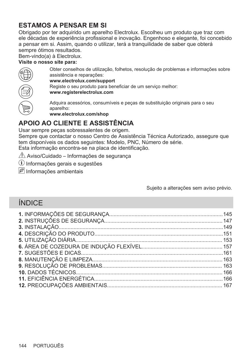 Obrigado por ter adquirido um aparelho Electrolux. Escolheu um produto que traz com ele décadas de experiência profissional e inovação. Engenhoso e elegante, foi concebido a pensar em si. Assim, quando o utilizar, terá a tranquilidade de saber que obterá sempre ótimos resultados. Bem-vindo(a) à Electrolux. Visite o nosso site para: Obter conselhos de utilização, folhetos, resolução de problemas e informações sobre assistência e reparações: www.electrolux.com/support Registe o seu produto para beneficiar de um serviço melhor: www.registerelectrolux.com Adquira acessórios, consumíveis e peças de substituição originais para o seu aparelho: www.electrolux.com/shop