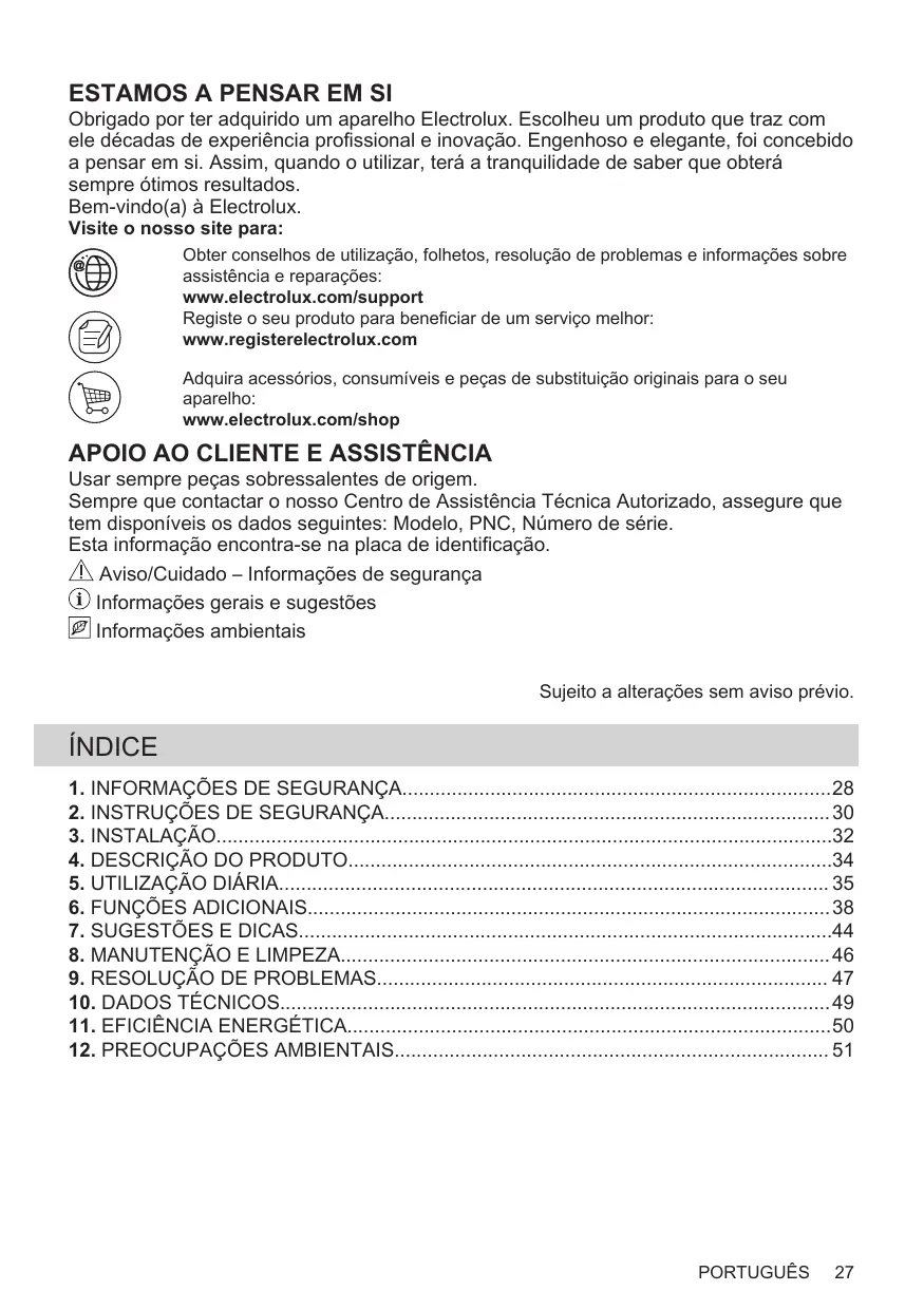 Obrigado por ter adquirido um aparelho Electrolux. Escolheu um produto que traz com ele décadas de experiência profissional e inovação. Engenhoso e elegante, foi concebido a pensar em si. Assim, quando o utilizar, terá a tranquilidade de saber que obterá sempre ótimos resultados. Bem-vindo(a) à Electrolux. Visite o nosso site para: Obter conselhos de utilização, folhetos, resolução de problemas e informações sobre assistência e reparações: www.electrolux.com/support Registe o seu produto para beneficiar de um serviço melhor: www.registerelectrolux.com Adquira acessórios, consumíveis e peças de substituição originais para o seu aparelho: www.electrolux.com/shop