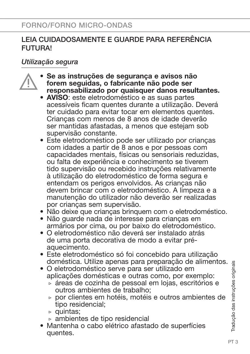 • Se for emitido fumo, desligue ou retire a ficha da tomada do eletrodoméstico e mantenha a porta fechada de modo a suprimir quaisquer chamas. PT 4