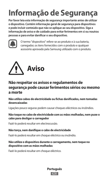 Informação de Segurança Por favor leia esta informação de segurança importante antes de utilizar o dispositivo. Contém informação geral de segurança para dispositivos e pode incluir conteúdo que não se aplique ao seu dispositivo. Siga a informação de aviso e de cuidado para evitar ferimentos em si ou noutras pessoas e para evitar danificar o seu dispositivo. O termo "dispositivo" refere-se ao produto e à sua bateria, carregador, os itens fornecidos com o produto e qualquer acessório aprovado pela Samsung utilizado com o produto.