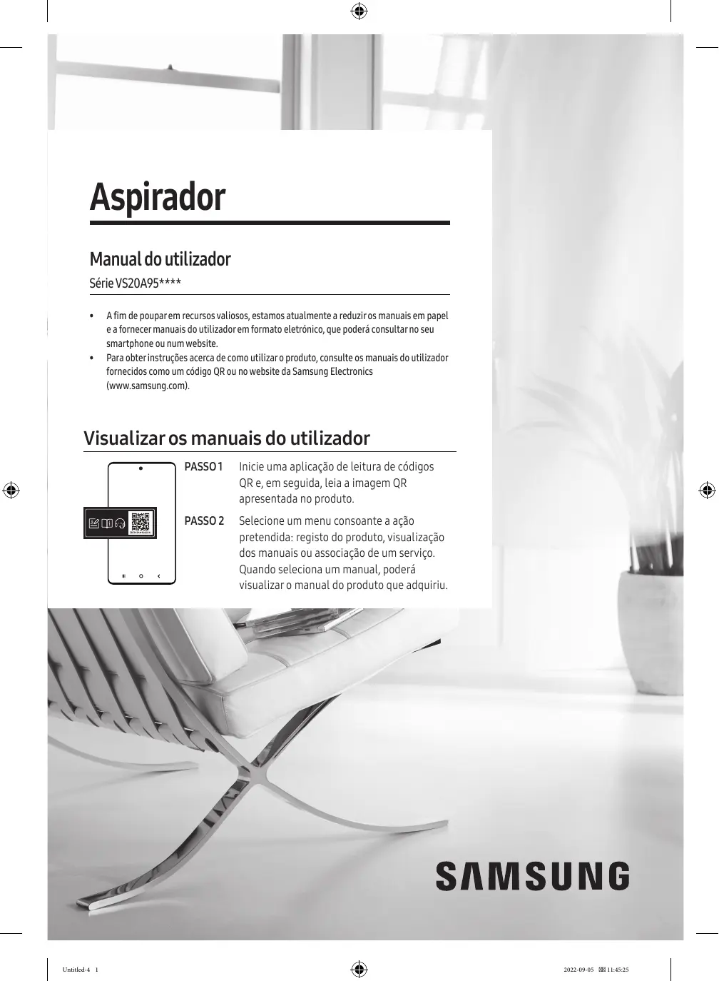 A fim de poupar em recursos valiosos, estamos atualmente a reduzir os manuais em papel e a fornecer manuais do utilizador em formato eletrónico, que poderá consultar no seu smartphone ou num website. Para obter instruções acerca de como utilizar o produto, consulte os manuais do utilizador fornecidos como um código QR ou no website da Samsung Electronics (www.samsung.com). Visualizar os manuais do utilizador Untitled-4 1 PASSO 1 Inicie uma aplicação de leitura de códigos QR e, em seguida, leia a imagem QR apresentada no produto. PASSO 2 Selecione um menu consoante a ação pretendida: registo do produto, visualização dos manuais ou associação de um serviço. Quando seleciona um manual, poderá visualizar o manual do produto que adquiriu. 2022-09-05 11:45:25 Informações de segurança Informações de segurança