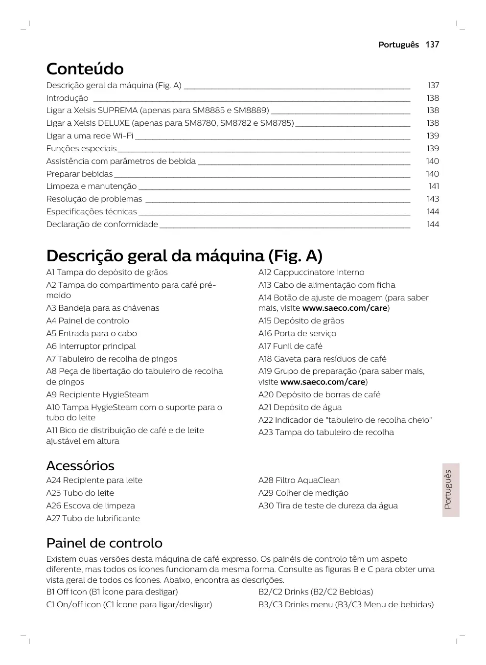 Introdução Parabéns pela sua compra de uma máquina de café totalmente automática da Saeco! Este manual do utilizador compacto irá ajudá-lo a utilizar rapidamente a sua máquina de café pela primeira vez. Para beneficiar plenamente da assistência online que a Saeco oferece, pode utilizar o painel de controlo para registar a sua máquina através da ligação Wi-Fi integrada ou aceder a www.saeco.com/MyCoffeeMachine e registar o seu produto. Aqui, também poderá encontrar a lista de perguntas mais frequentes, bem como a versão alargada do manual de utilizador. Leia atentamente o folheto de segurança separado antes de utilizar a máquina pela primeira vez e guarde-o para uma eventual consulta futura. A máquina de café automática Saeco permite-lhe ligar-se à sua rede Wi-Fi para melhorar a sua experiência de café. Se ligar a sua máquina à sua rede Wi-Fi, poderá: - Receber recomendações personalizadas baseadas em aprendizagem automática - Desfrutar de atualizações regulares de software para melhorar a sua experiência de utilizador - Utilizar a funcionalidade da loja, se disponível no seu país - associar a máquina à sua conta Amazon para substituição de acessórios, se esta opção estiver disponível no seu país - Ligar-se ao seu dispositivo doméstico Alexa para utilizar o controlo de voz, se disponível no seu país Nota: esta máquina foi testada com café. Embora tenha sido limpa cuidadosamente, poderá conter alguns resíduos de café. No entanto, garantimos que é totalmente nova.