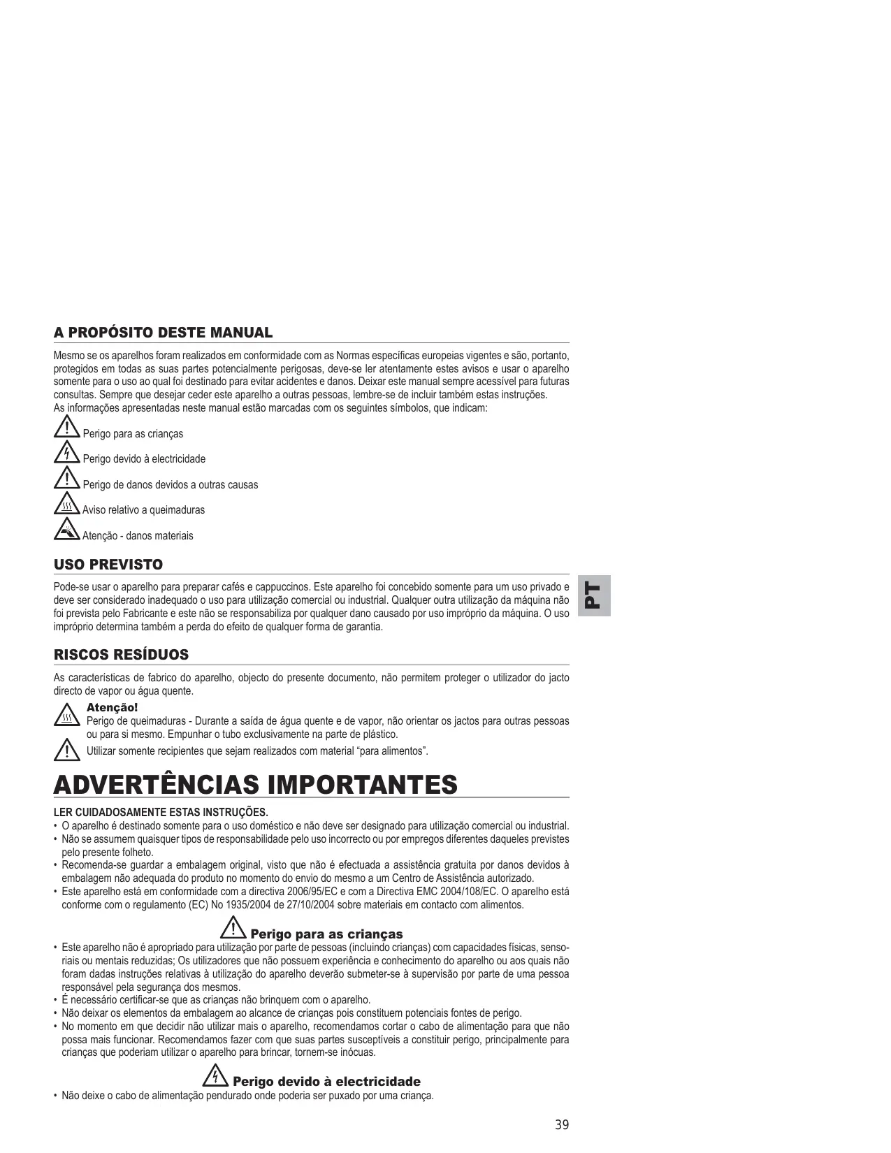 A PROPÓSITO DESTE MANUAL Mesmo se os aparelhos foram realizados em conformidade com as Normas específicas europeias vigentes e são, portanto, protegidos em todas as suas partes potencialmente perigosas, deve-se ler atentamente estes avisos e usar o aparelho somente para o uso ao qual foi destinado para evitar acidentes e danos. Deixar este manual sempre acessível para futuras consultas. Sempre que desejar ceder este aparelho a outras pessoas, lembre-se de incluir também estas instruções. As informações apresentadas neste manual estão marcadas com os seguintes símbolos, que indicam: Perigo para as crianças Perigo devido à electricidade Perigo de danos devidos a outras causas Aviso relativo a queimaduras Atenção - danos materiais