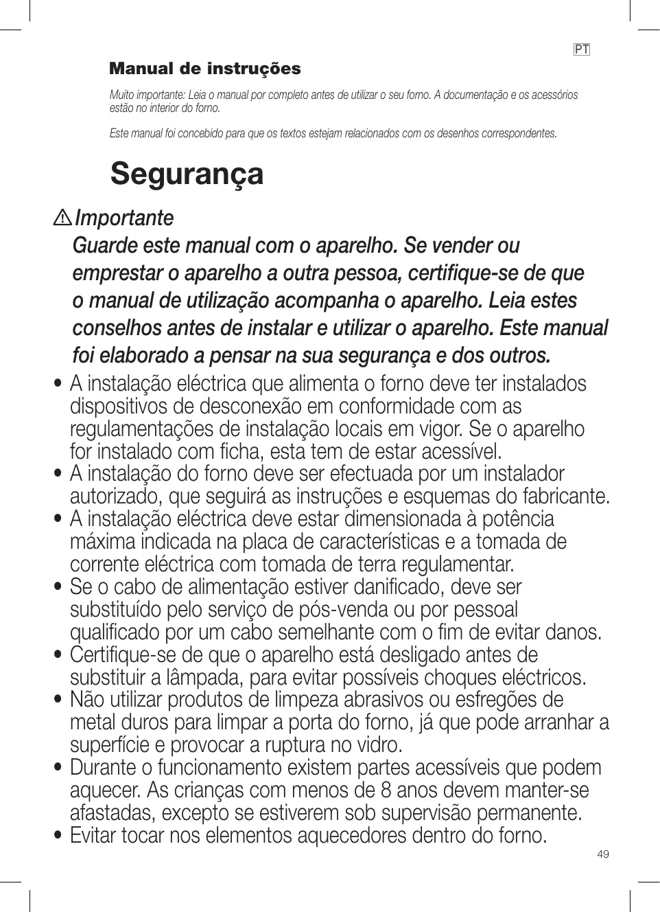 8 ans et des personnes souffrant d’un handicap physique, sensoriel ou mental, ou manquant d’expérience et de connaissances, à condition que des instructions appropriés leur aient été données concernant l’utilisation de l’appareil en toute sécurité et qu’elles comprennent les dangers encourus. Ne pas laisser les enfants jouer avec l’appareil. Ne pas laisser les enfants s’occuper de l’entretien ni de la maintenance de l’appareil sans surveillance. • Cet appareil est destiné à un usage domestique normal. Ne pas l’utiliser a des fins commerciales ni industrielles. Il est destiné exclusivement à la cuisson de denrées alimentaires. • N’essayez pas de modifier les caractéristiques de l’appareil, cela représenterait un danger. • Ne posez pas de charges lourdes sur la porte du four et assurez-vous qu’aucun enfant ne puisse n’y monter n’y s’asseoir. • Pour toute intervention de nettoyage dans la cavité du four, le four doit être arrêté. • Après utilisation du four, assurez-vous que toutes les commandes se trouvent sur la position arrêt. • Ne vous servez pas du four comme garde-manger ni pour y ranger les accessoires après utilisation. • N’utilisez jamais d’appareils à vapeur ou à haute pression pour nettoyer le four (exigences relatives à la sécurité électrique). • Le four doit toujours fonctionner porte fermée, dans tous les programmes, y compris le grill. • Pour mettre en place les plateaux/grilles, il faut suivre les indications de la section Utilisation/Accessoires. • Si l’appareil peut intégrer un panneau de commandes d’un second appareil, il faut uniquement utiliser des plans de travail commandés par le fabricant. 20
