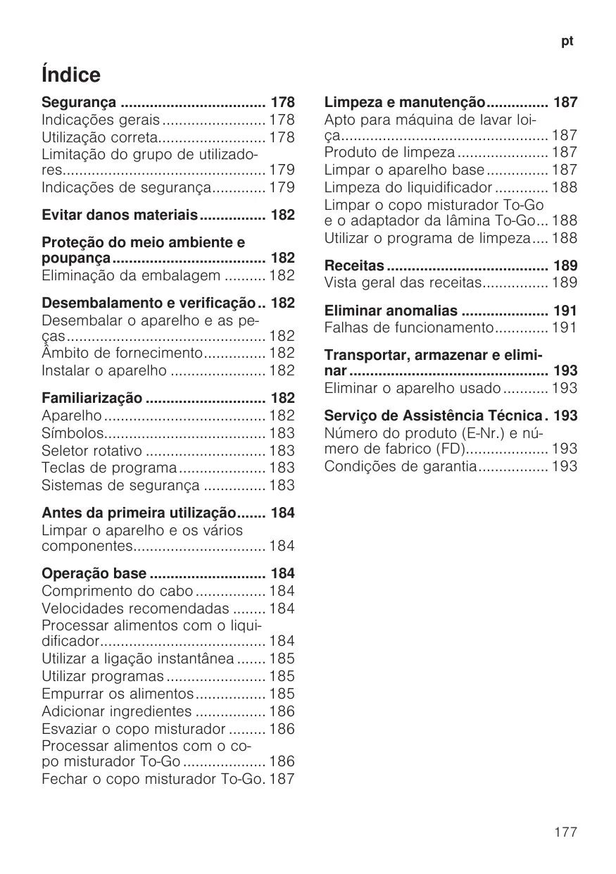 Limpeza e manutenção 187 Apto para máquina de lavar loiça 187 Produto de limpeza 187 Limpar o aparelho base 187 Limpeza do liquidificador 188 Limpar o copo misturador To-Go e o adaptador da lâmina To-Go... 188 Utilizar o programa de limpeza .... 188 Receitas 189 Vista geral das receitas 189 Eliminar anomalias 191 Falhas de funcionamento 191 Transportar, armazenar e eliminar 193 Eliminar o aparelho usado 193 Serviço de Assistência Técnica . 193 Número do produto (E-Nr.) e número de fabrico (FD) 193 Condições de garantia 193