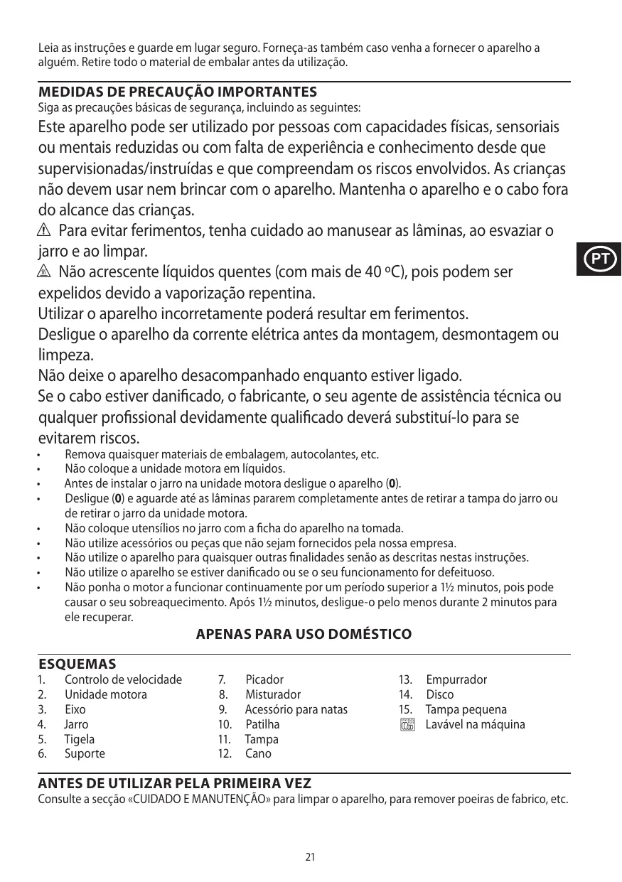 No ponga utensilios en la jarra cuando el aparato esté enchufado. No utilice ningún accesorio que no haya sido adquirido del fabricante. No use el aparato para ningún fin distinto a los descritos en estas instrucciones. No use el aparato si está dañado o si no funciona bien. No haga funcionar el motor constantemente por más de 1 minuto y medio, se puede sobrecalentar. Después de 1 minuto y medio, apáguelo durante al menos 2 minutos, para que se recupere.