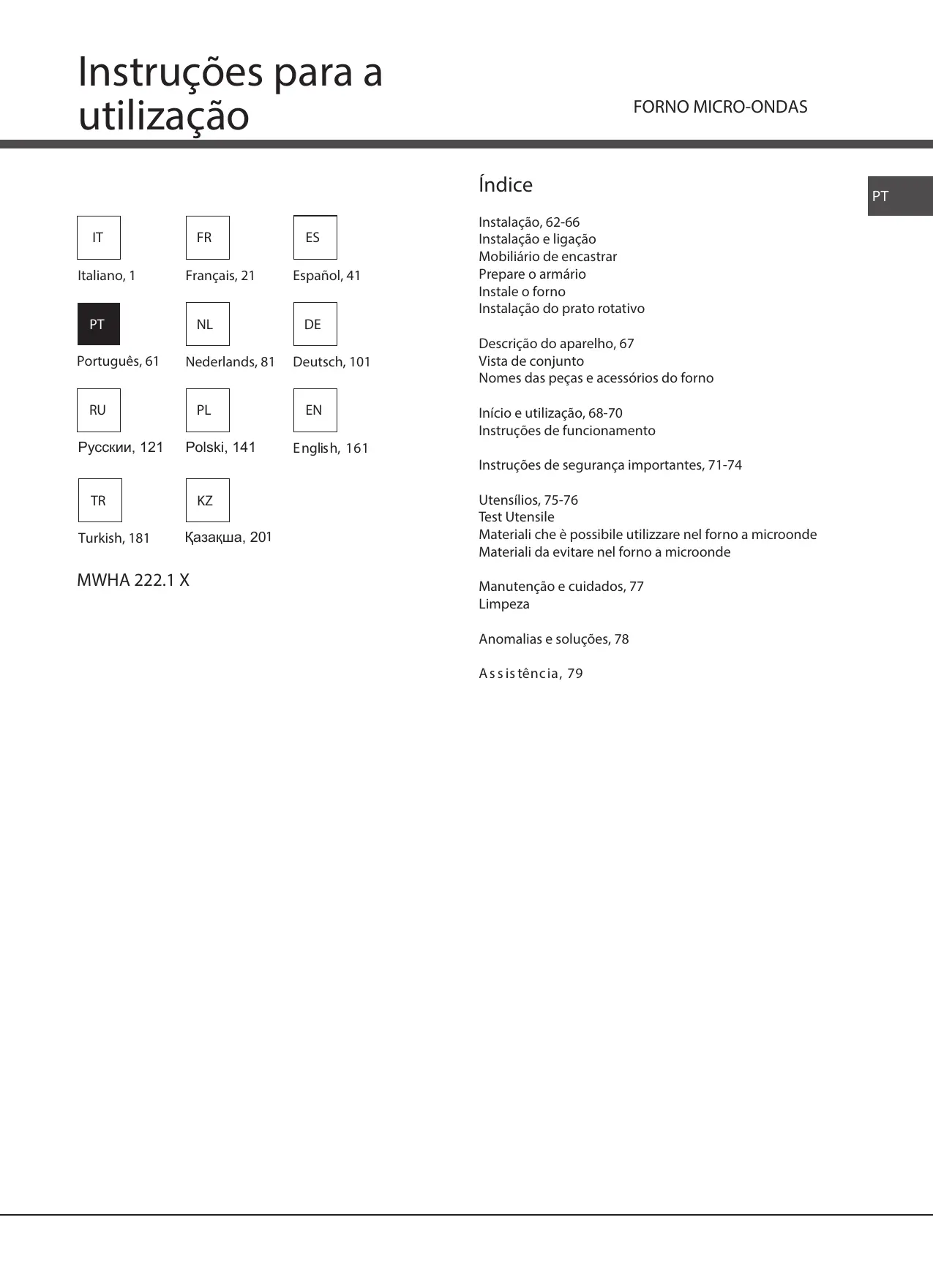 PT Instalação, 62-66 Instalação e ligação Mobiliário de encastrar Prepare o armário Instale o forno Instalação do prato rotativo Descrição do aparelho, 67 Vista de conjunto Nomes das peças e acessórios do forno Início e utilização, 68-70 Instruções de funcionamento Instruções de segurança importantes, 71-74 Utensílios, 75-76 Test Utensile Materiali che è possibile utilizzare nel forno a microonde Materiali da evitare nel forno a microonde Manutenção e cuidados, 77 Limpeza Anomalias e soluções, 78 A s s is tênc ia, 7 9