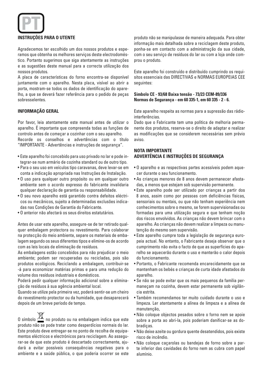 Il est important que vous compreniez bien toutes les fonctions de contrôle avant de commencer à cuisiner avec votre four. N’oubliez pas les conseils et les mises en garde indiqués sous le titre « IMPORTANT - Mises en garde et instructions de sécurité». • Cet appareil a été dessiné pour une utilisation privée dans les logements et peut être intégré dans une armoire de cuisine standard ou d’un autre type. • Pour son utilisation dans des véhicules du type caravanes, tenir compte de l’indication appropriée dans les Instructions d’Installation. • L’utilisation dans tout autre but ou dans tout autre milieu sans l’accord exprès du fabricant annulera toute déclaration de garantie ou de responsabilité. • Votre nouvel appareil est garanti contre tous défauts électriques ou mécaniques ; la garantie est soumise à des exclusions déterminées qui sont indiquées dans les Conditions de Garantie du Fabricant. • Ce qui précède n’affectera pas ses droits statutaires. Avant d’utiliser cet appareil, assurez-vous d’avoir retiré tout emballage de protection ou revêtement. Pour collaborer dans la protection de l’environnement, séparez les matériels d’emballage selon leurs différents types et éliminez-les conformément aux lois locales d’élimination de résidus. Les emballages sont conçus pour ne pas nuire l’environnement ; étant des produits écologiques, ils peuvent être récupérés ou recyclés. En recyclant l’emballage, vous contribuerez à une économie de matières premières et à une réduction du volume des détritus industriels et ménagers. Pour toute information supplémentaire sur l’élimination de résidus, veuillez vous adresser à votre agence environnementale locale. La première fois que vous utiliserez votre appareil, une odeur pourra se dégagée du revêtement protecteur ou de l’humidité ; cette odeur disparaîtra rapidement. Le symbole sur le produit ou sur son emballage indique que ce produit ne peut être traité comme les déchets ménagers normaux. Ce produit doit être remis au point de ramas-