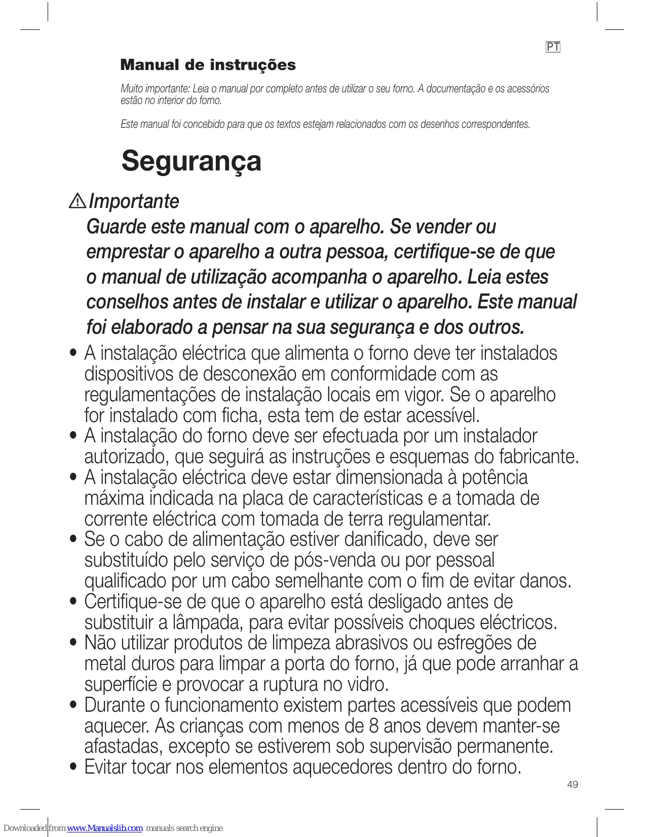 8 ans et des personnes souffrant d’un handicap physique, sensoriel ou mental, ou manquant d’expérience et de connaissances, à condition que des instructions appropriés leur aient été données concernant l’utilisation de l’appareil en toute sécurité et qu’elles comprennent les dangers encourus. Ne pas laisser les enfants jouer avec l’appareil. Ne pas laisser les enfants s’occuper de l’entretien ni de la maintenance de l’appareil sans surveillance. • Cet appareil est destiné à un usage domestique normal. Ne pas l’utiliser a des fins commerciales ni industrielles. Il est destiné exclusivement à la cuisson de denrées alimentaires. • N’essayez pas de modifier les caractéristiques de l’appareil, cela représenterait un danger. • Ne posez pas de charges lourdes sur la porte du four et assurez-vous qu’aucun enfant ne puisse n’y monter n’y s’asseoir. • Pour toute intervention de nettoyage dans la cavité du four, le four doit être arrêté. • Après utilisation du four, assurez-vous que toutes les commandes se trouvent sur la position arrêt. • Ne vous servez pas du four comme garde-manger ni pour y ranger les accessoires après utilisation. • N’utilisez jamais d’appareils à vapeur ou à haute pression pour nettoyer le four (exigences relatives à la sécurité électrique). • Le four doit toujours fonctionner porte fermée, dans tous les programmes, y compris le grill. • Pour mettre en place les plateaux/grilles, il faut suivre les indications de la section Utilisation/Accessoires. • Si l’appareil peut intégrer un panneau de commandes d’un second appareil, il faut uniquement utiliser des plans de travail commandés par le fabricant. 20