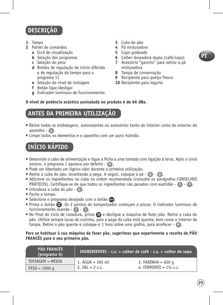 INÍCIO RÁPIDO • Desenrole o cabo de alimentação e ligue a ficha a uma tomada com ligação à terra. Após o sinal sonoro, o programa 1 aparece por defeito - H . • Pode ser libertado um ligeiro odor durante a primeira utilização. • Retire a cuba do pão, levantando a pega. A seguir, coloque a pá - B - D . • Adicione os ingredientes na cuba na ordem recomendada (consulte os parágrafos CONSELHOS PRÁTICOS). Certifique-se de que todos os ingredientes são pesados com exatidão - E - F . • Introduza a cuba do pão - G . • Feche a tampa. • Selecione o programa desejado com o botão . • Prima o botão . Os 2 pontos do temporizador começam a piscar. O indicador luminoso de funcionamento acende - I - J . • No final do ciclo de cozedura, prima e desligue a máquina de fazer pão. Retire a cuba do pão. Utilize sempre luvas de cozinha, pois a pega da cuba está quente, bem como o interior da tampa. Retire o pão quente e coloque-o 1 hora sobre uma grelha, para arrefecer - K . Para se habituar à sua máquina de fazer pão, sugerimos que experimente a receita do PÃO FRANCÊS para o seu primeiro pão. PÃO FRANCÊS (programa 6) TOSTAGEM = MÉDIA PESO = 1000 g