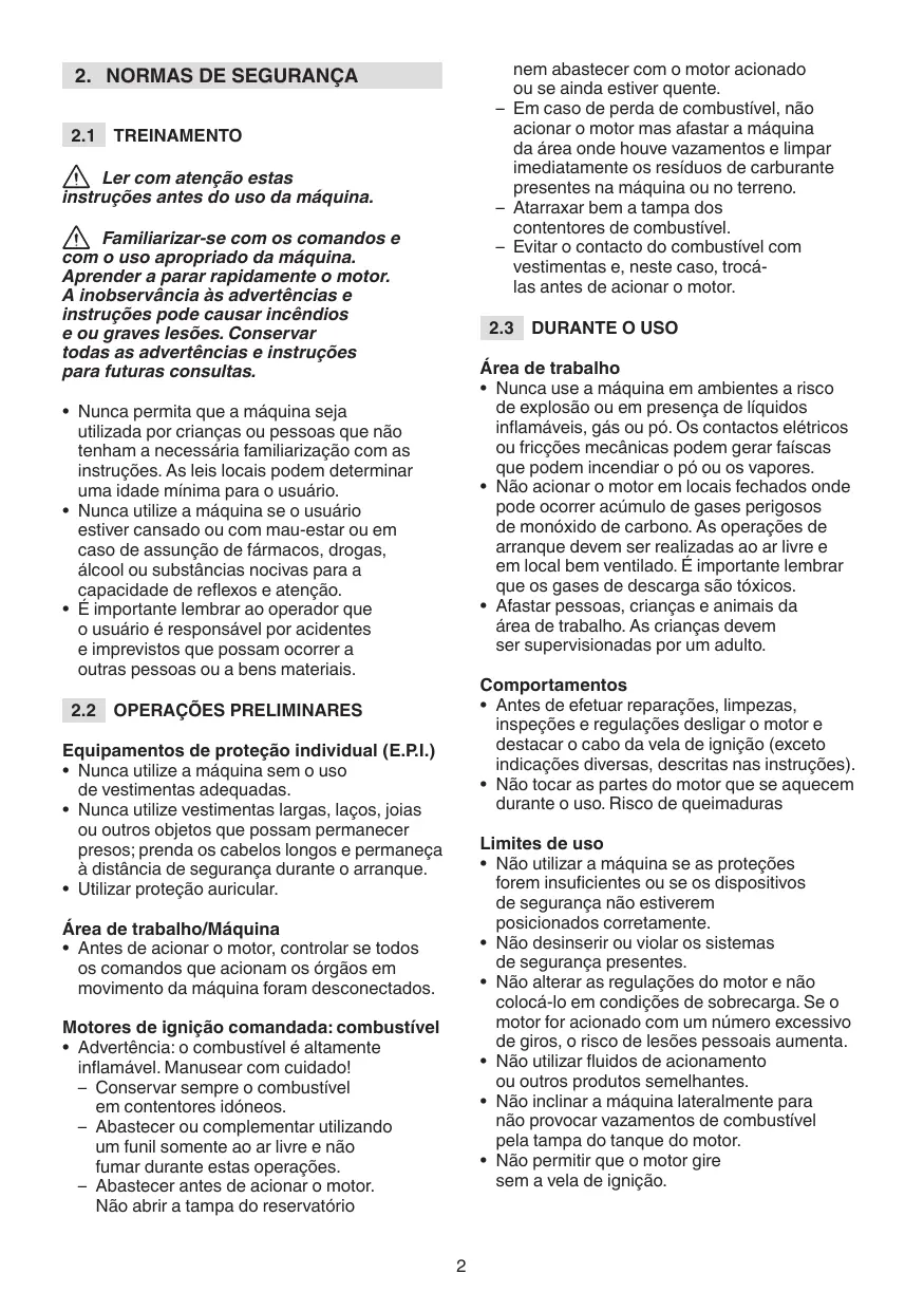 - Antes de acionar o motor, controlar se todos os comandos que acionam os órgãos em movimento da máquina foram desconectados. Motores de ignição comandada: combustível