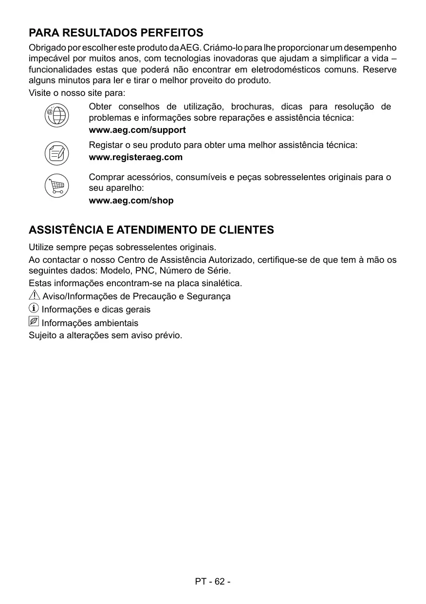PARA RESULTADOS PERFEITOS Obrigado por escolher este produto da AEG. Criámo-lo para lhe proporcionar um desempenho impecável por muitos anos, com tecnologias inovadoras que ajudam a simplificar a vida – funcionalidades estas que poderá não encontrar em eletrodomésticos comuns. Reserve alguns minutos para ler e tirar o melhor proveito do produto. Visite o nosso site para: Obter conselhos de utilização, brochuras, dicas para resolução de problemas e informações sobre reparações e assistência técnica: www.aeg.com/support Registar o seu produto para obter uma melhor assistência técnica: www.registeraeg.com Comprar acessórios, consumíveis e peças sobresselentes originais para o seu aparelho: www.aeg.com/shop