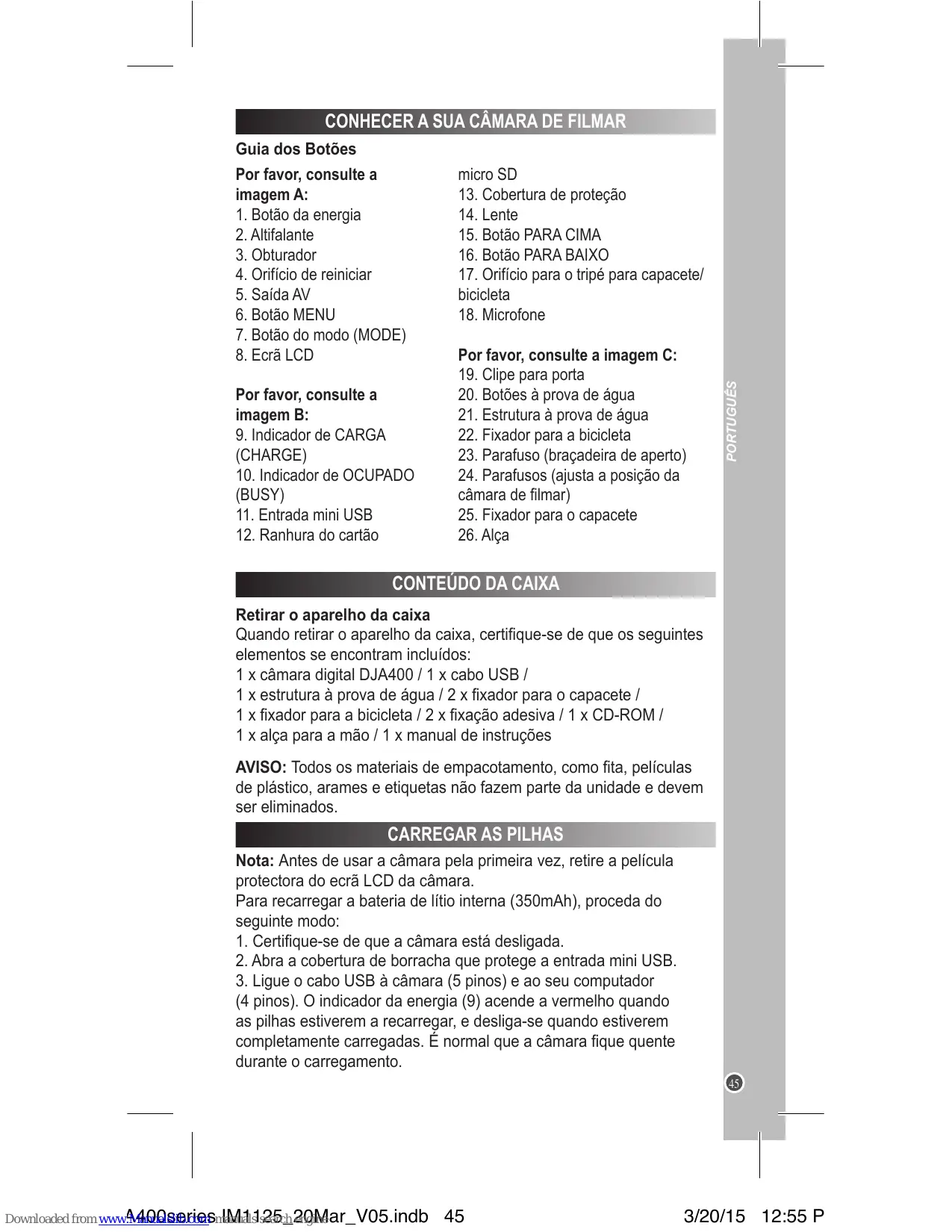 Lors du déballage, assurez-vous que les pièces suivantes soient incluses : 1 x Caméra numérique DJA400 / 1 x Câble USB / 1 x Boîtier étanche / 2 x Support de casque / 1 x Support de vélo / 2x Fixation adhésive / 1 x CD-ROM / 1 x Dragonne / 1 x Notice d’utilisation AVERTISSEMENT : Tous les matériaux d’emballage, comme le scotch, les feuilles en plastique, les ficelles et les étiquettes ne font pas partie du produit et doivent être jetés.