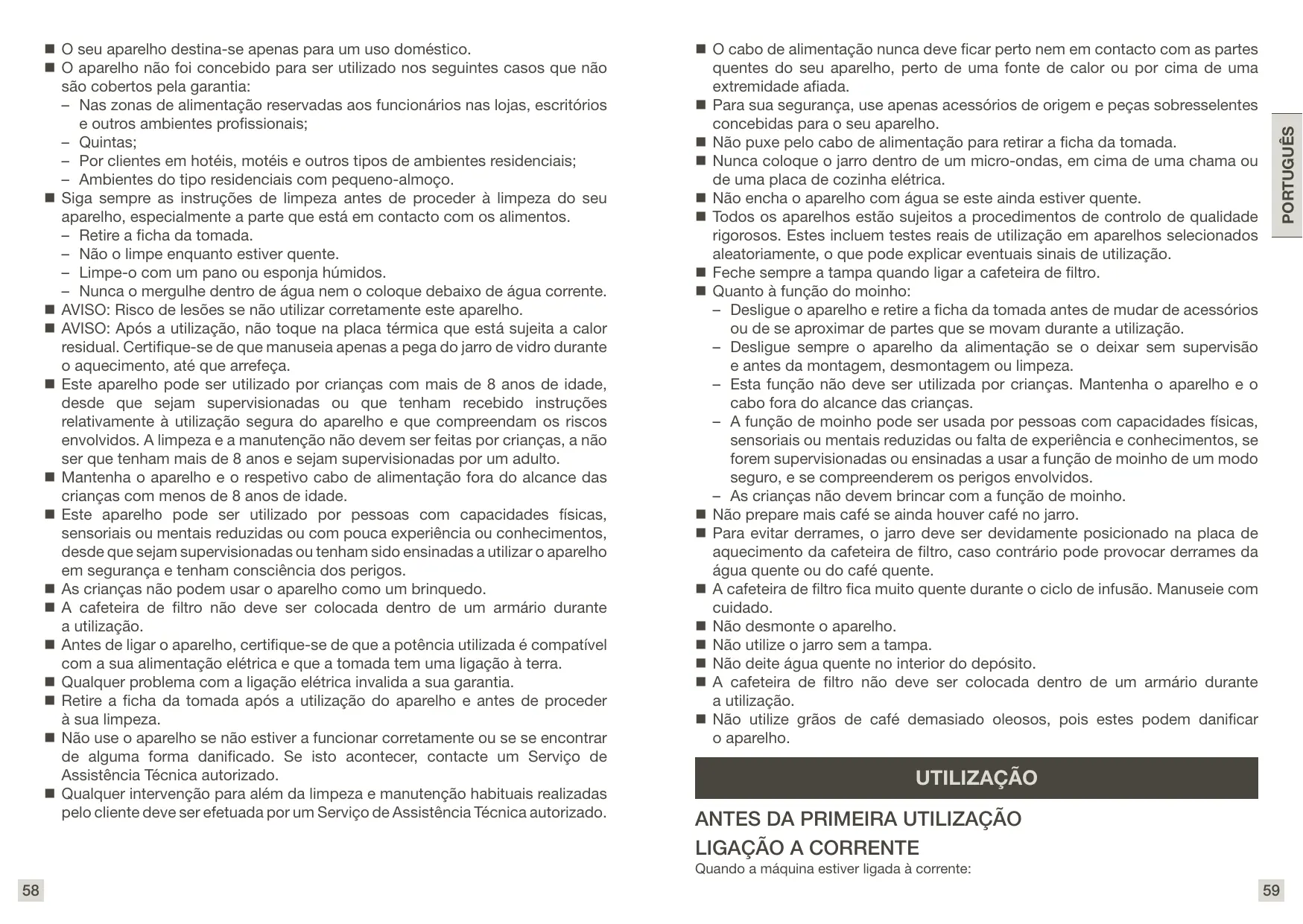 O cabo de alimentação nunca deve ficar perto nem em contacto com as partes quentes do seu aparelho, perto de uma fonte de calor ou por cima de uma extremidade afiada. Para sua segurança, use apenas acessórios de origem e peças sobresselentes concebidas para o seu aparelho. Não puxe pelo cabo de alimentação para retirar a ficha da tomada. Nunca coloque o jarro dentro de um micro-ondas, em cima de uma chama ou de uma placa de cozinha elétrica. Não encha o aparelho com água se este ainda estiver quente. Todos os aparelhos estão sujeitos a procedimentos de controlo de qualidade rigorosos. Estes incluem testes reais de utilização em aparelhos selecionados aleatoriamente, o que pode explicar eventuais sinais de utilização. Feche sempre a tampa quando ligar a cafeteira de filtro. Quanto à função do moinho: – Desligue o aparelho e retire a ficha da tomada antes de mudar de acessórios ou de se aproximar de partes que se movam durante a utilização. – Desligue sempre o aparelho da alimentação se o deixar sem supervisão e antes da montagem, desmontagem ou limpeza. – Esta função não deve ser utilizada por crianças. Mantenha o aparelho e o cabo fora do alcance das crianças. – A função de moinho pode ser usada por pessoas com capacidades físicas, sensoriais ou mentais reduzidas ou falta de experiência e conhecimentos, se forem supervisionadas ou ensinadas a usar a função de moinho de um modo seguro, e se compreenderem os perigos envolvidos. – As crianças não devem brincar com a função de moinho. Não prepare mais café se ainda houver café no jarro. Para evitar derrames, o jarro deve ser devidamente posicionado na placa de aquecimento da cafeteira de filtro, caso contrário pode provocar derrames da água quente ou do café quente. A cafeteira de filtro fica muito quente durante o ciclo de infusão. Manuseie com cuidado. Não desmonte o aparelho. Não utilize o jarro sem a tampa. Não deite água quente no interior do depósito. A cafeteira de filtro não deve ser colocada dentro de um armário durante a utilização. Não utilize grãos de café demasiado oleosos, pois estes podem danificar o aparelho.