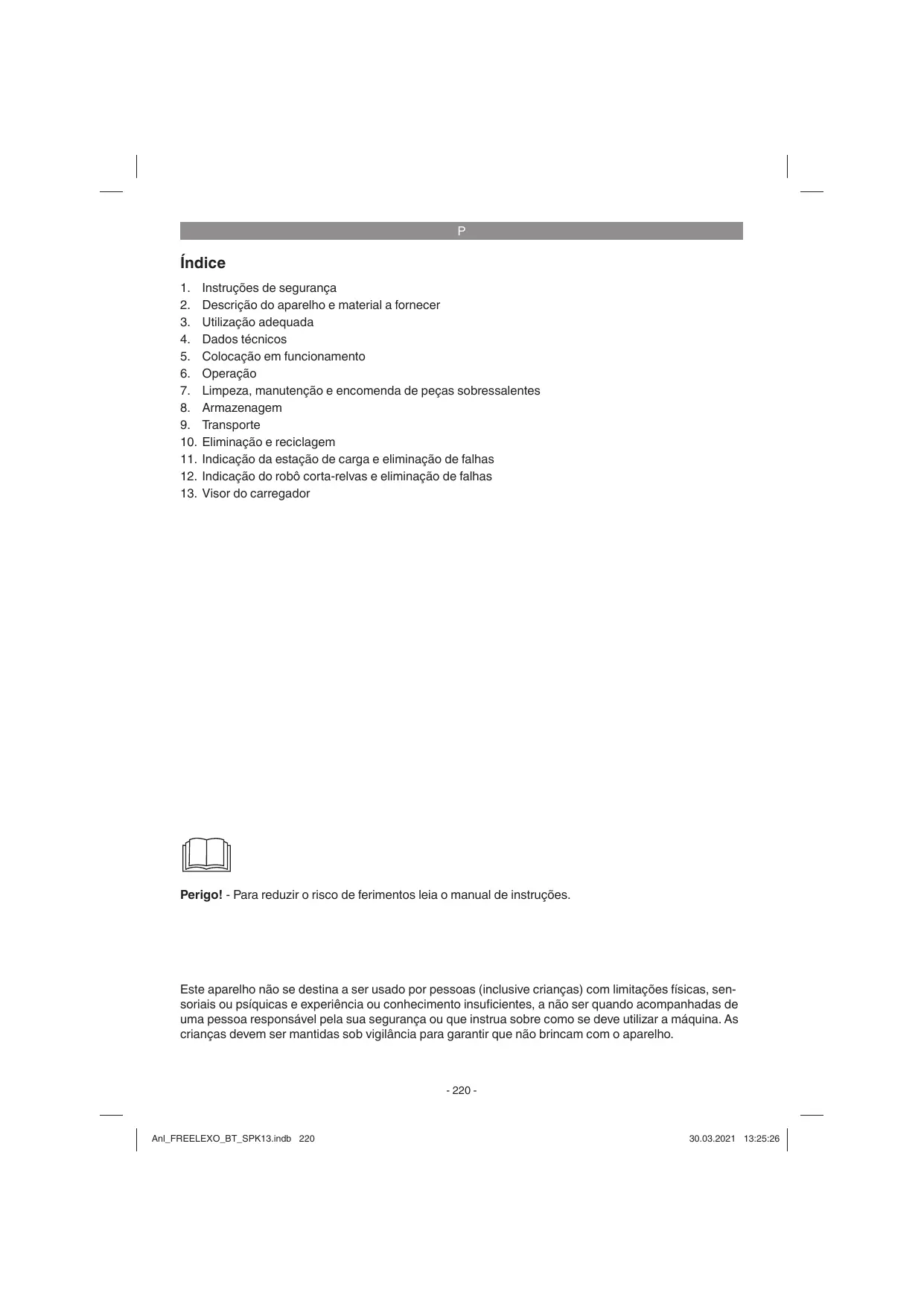 - La temperatura de la batería no se encuentra dentro del rango óptimo. Medida: Esperar hasta que el proceso de carga haya finalizado, la batería puede seguir cargándose. Parpadea Parpadea Pega de transporte Interruptor principal Roda traseira Tampa do compartimento da bateria Lâminas de substituição Fio de delimitação Estação de carga Pino de carregamento Visor LED Bateria Carregador Chave Allen • Fio de delimitação • Conector de cabos • Chave Allen • Bateria • Carregador Potência de transmissão máxima ..21,18 dBuA/m Ligação Bluetooth Faixa de frequência de operação 2400-2483,5 MHz Potência de transmissão máxima -0,5 dBm Alimentador Tensão de entrada: 100- 240 V ~ 50 /60 Hz Explicação das opções de teclas no painel de comando (figura 9b) 60. Tecla POWER: ligar e desligar o robô cortarelvas 61. Tecla „OK“ EN 300 328; EN 303 447; EN 50663; EN 62321