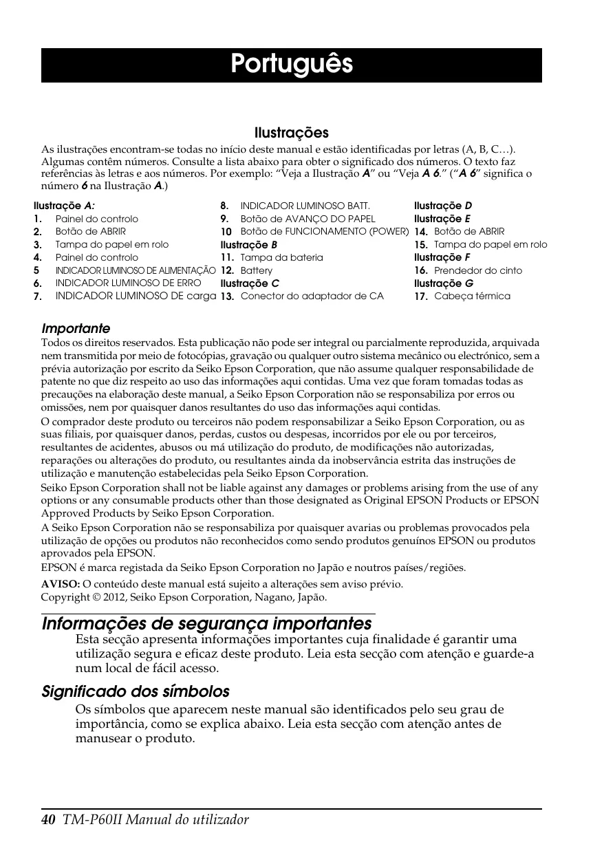 Importante Todos os direitos reservados. Esta publicação não pode ser integral ou parcialmente reproduzida, arquivada nem transmitida por meio de fotocópias, gravação ou qualquer outro sistema mecânico ou electrónico, sem a prévia autorização por escrito da Seiko Epson Corporation, que não assume qualquer responsabilidade de patente no que diz respeito ao uso das informações aqui contidas. Uma vez que foram tomadas todas as precauções na elaboração deste manual, a Seiko Epson Corporation não se responsabiliza por erros ou omissões, nem por quaisquer danos resultantes do uso das informações aqui contidas. O comprador deste produto ou terceiros não podem responsabilizar a Seiko Epson Corporation, ou as suas filiais, por quaisquer danos, perdas, custos ou despesas, incorridos por ele ou por terceiros, resultantes de acidentes, abusos ou má utilização do produto, de modificações não autorizadas, reparações ou alterações do produto, ou resultantes ainda da inobservância estrita das instruções de utilização e manutenção estabelecidas pela Seiko Epson Corporation. Seiko Epson Corporation shall not be liable against any damages or problems arising from the use of any options or any consumable products other than those designated as Original EPSON Products or EPSON Approved Products by Seiko Epson Corporation. A Seiko Epson Corporation não se responsabiliza por quaisquer avarias ou problemas provocados pela utilização de opções ou produtos não reconhecidos como sendo produtos genuínos EPSON ou produtos aprovados pela EPSON. EPSON é marca registada da Seiko Epson Corporation no Japão e noutros países/regiões. AVISO: O conteúdo deste manual está sujeito a alterações sem aviso prévio. Copyright © 2012, Seiko Epson Corporation, Nagano, Japão.