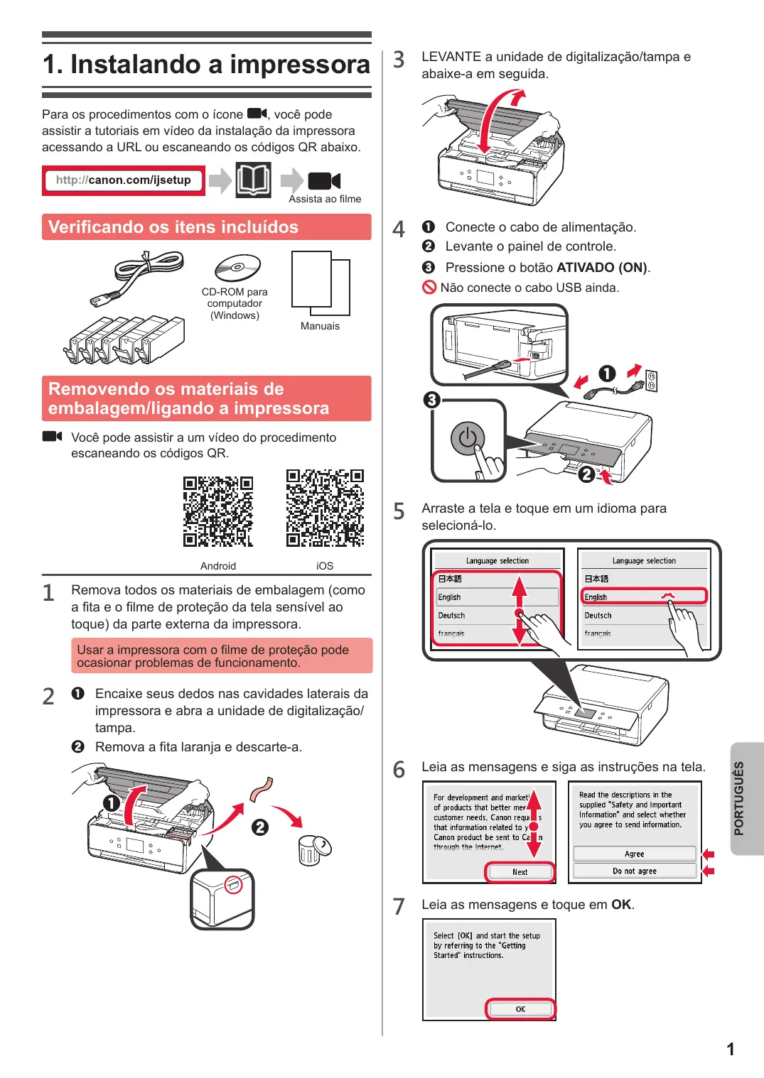 Para os procedimentos com o ícone , você pode assistir a tutoriais em vídeo da instalação da impressora acessando a URL ou escaneando os códigos QR abaixo.