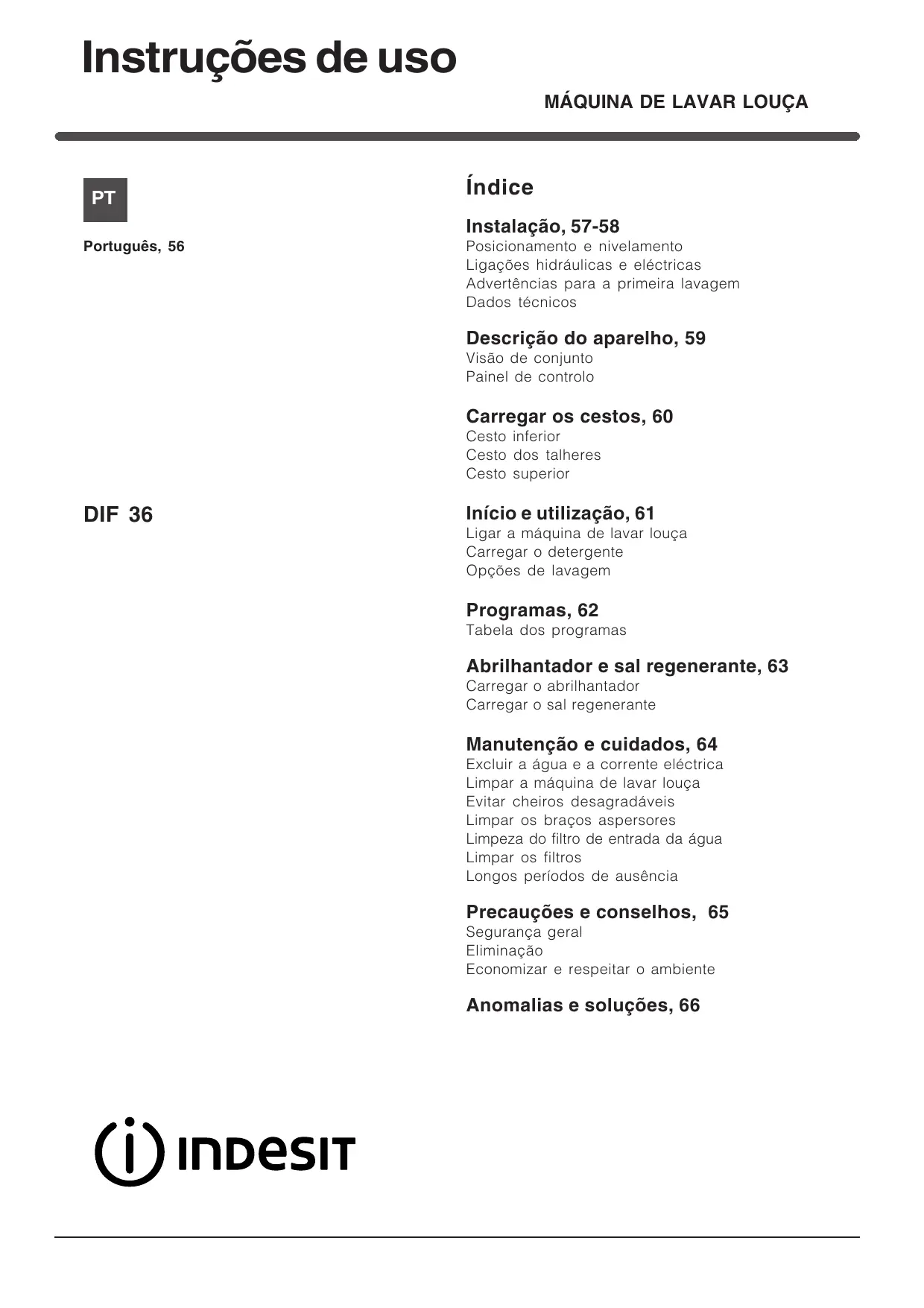Baixe as instruções para o seu em formato PDF gratuitamente! Encontre o seu manual D 36A - INDESIT e retome o controlo do seu dispositivo eletrónico. Nesta página estão publicados todos os documentos necessários para a utilização do seu dispositivo. D 36A da marca INDESIT.