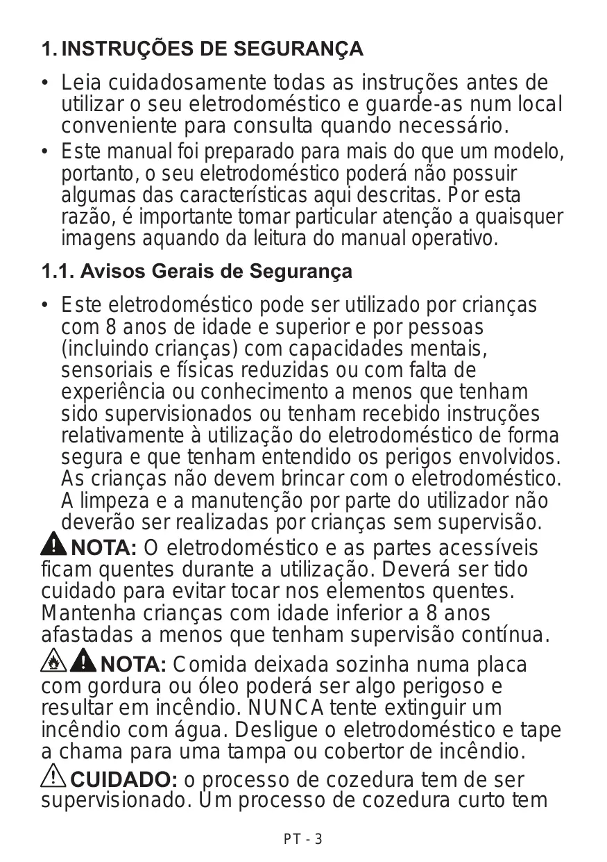 • Este eletrodoméstico pode ser utilizado por crianças com 8 anos de idade e superior e por pessoas (incluindo crianças) com capacidades mentais, sensoriais e físicas reduzidas ou com falta de experiência ou conhecimento a menos que tenham sido supervisionados ou tenham recebido instruções relativamente à utilização do eletrodoméstico de forma segura e que tenham entendido os perigos envolvidos. As crianças não devem brincar com o eletrodoméstico. A limpeza e a manutenção por parte do utilizador não deverão ser realizadas por crianças sem supervisão. NOTA: O eletrodoméstico e as partes acessíveis ficam quentes durante a utilização. Deverá ser tido cuidado para evitar tocar nos elementos quentes. Mantenha crianças com idade inferior a 8 anos afastadas a menos que tenham supervisão contínua. NOTA: Comida deixada sozinha numa placa com gordura ou óleo poderá ser algo perigoso e resultar em incêndio. NUNCA tente extinguir um incêndio com água. Desligue o eletrodoméstico e tape a chama para uma tampa ou cobertor de incêndio. CUIDADO: o processo de cozedura tem de ser supervisionado. Um processo de cozedura curto tem PT - 3