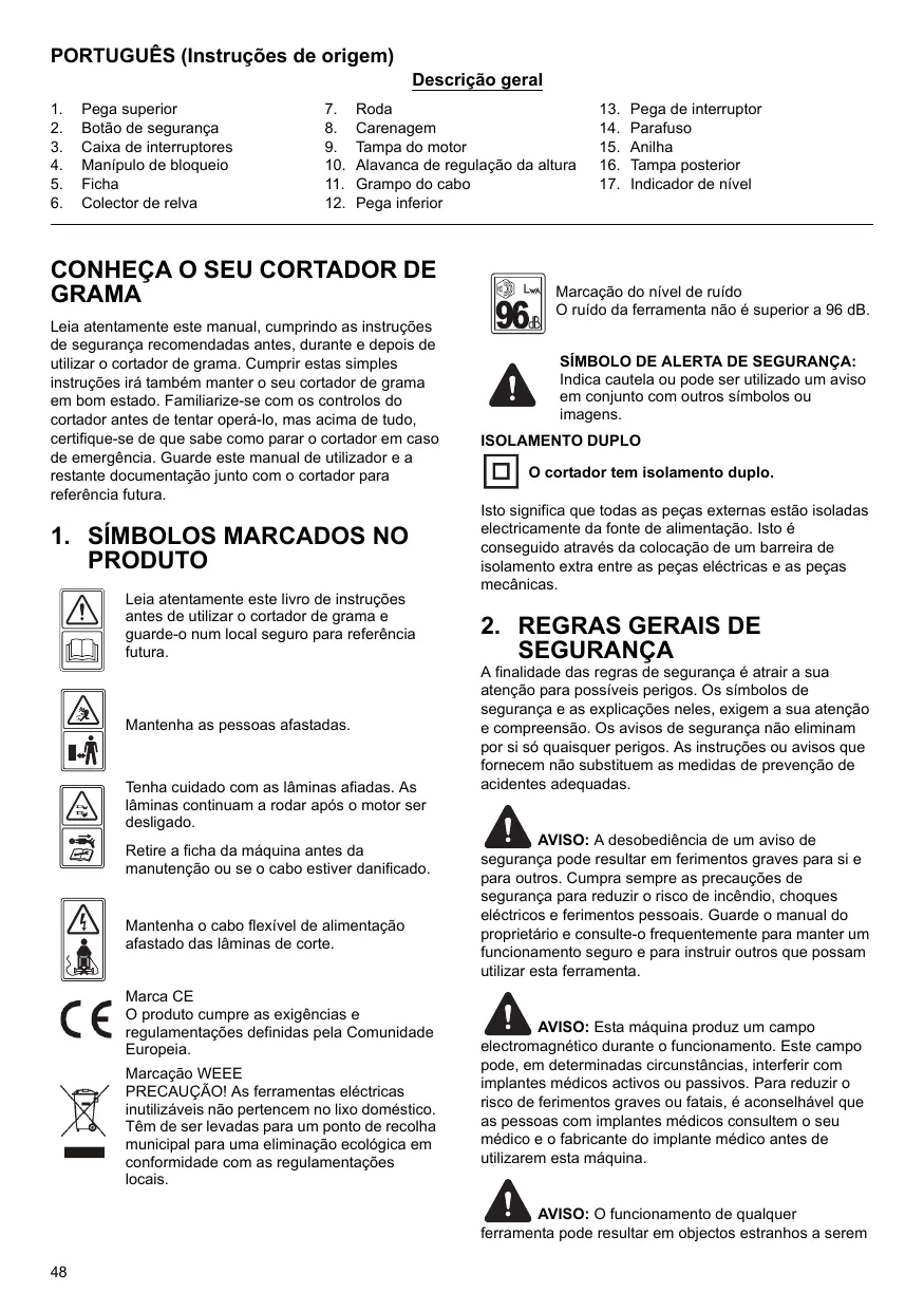 14. Le niveau sonore de votre outil ne dépasse pas 96 dB. SYMBOLE D’ALERTE DE SÉCURITÉ : Indique qu’une précaution ou une mise en garde peut être utilisée avec d’autres symboles ou images. DOUBLE ISOLATION Votre tondeuse est doublement isolée. Cela signifie que toutes les parties externes sont isolées électriquement de l’alimentation. Pour cela, une barrière d’isolation supplémentaire est placée entre les parties électriques et mécaniques.