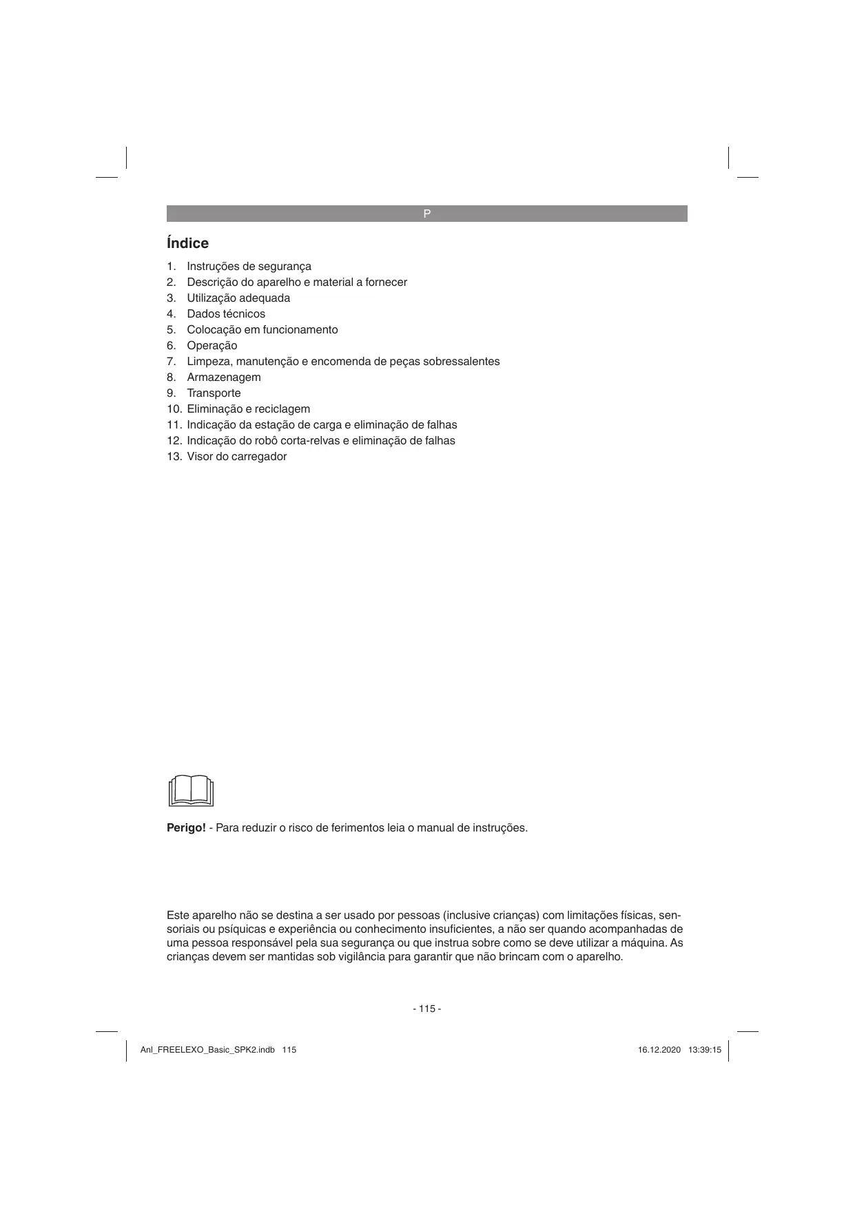 7. Interruptor principal 8. Roda traseira 9. Tampa do compartimento da bateria 18. Fio de delimitação 19. Estação de carga 20. Pino de carregamento 21. Visor LED 22. Bateria 23. Carregador • Fio de delimitação • Conector de cabos • Chave Allen • Bateria • Carregador E declara la siguiente conformidad a tenor de la directiva y normas de la UE para el artículo P declara a seguinte conformidade, de acordo com as diretiva CE e normas para o artigo DK attesterer følgende overensstemmelse i medfør af EU-direktiv samt standarder for artikel EN 300 328; EN 303 447; EN 50663; EN 62321