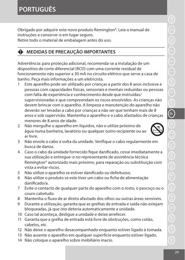 Advertência: para proteção adicional, recomenda-se a instalação de um dispositivo de corte diferencial (RCD) com uma corrente residual de funcionamento não superior a 30 mA no circuito elétrico que serve a casa de banho. Peça mais informações a um eletricista. 1 Este aparelho pode ser utilizado por crianças a partir dos 8 anos inclusive e pessoas com capacidades físicas, sensoriais e mentais reduzidas ou pessoas com falta de experiência e conhecimento desde que instruídas/ supervisionadas e que compreendam os riscos envolvidos. As crianças não devem brincar com o aparelho. A limpeza e manutenção do aparelho não deverão ser levadas a cabo por crianças a não ser que tenham mais de 8 anos e sob supervisão. Mantenha o aparelho e o cabo afastados de crianças menores de 8 anos de idade. 2 Não mergulhe o aparelho em líquidos, não o utilize próximo de água numa banheira, lavatório ou qualquer outro recipiente ou ao ar livre. 3 Não enrole o cabo à volta da unidade. Verifique o cabo regularmente em busca de danos. 4 Caso o cabo da unidade fornecido fique danificado, cesse imediatamente a sua utilização e entregue-o no representante de assistência técnica Remington® autorizado mais próximo, para reparação ou substituição com vista a evitar riscos. 5 Não utilize o aparelho se estiver danificado ou defeituoso. 6 Não utilize o produto se este tiver um cabo ou ficha de alimentação danificado/a. 7 Evite o contacto de qualquer parte do aparelho com o rosto, o pescoço ou o couro cabeludo. 8 Mantenha o fluxo de ar direto afastado dos olhos ou outras áreas sensíveis. 9 Durante a utilização, garanta que as grelhas de entrada e saída não estejam bloqueadas, já que isto deteria automaticamente a unidade. 10 Caso tal aconteça, desligue a unidade e deixe arrefecer. 11 Garanta que a grelha de entrada está livre de obstruções, como cotão, cabelos, etc. 12 Não deixe o aparelho desacompanhado enquanto estiver ligado à tomada. 13 Não assente o aparelho em qualquer superfície enquanto estiver ligado. 14 Não coloque o aparelho sobre mobiliário macio.