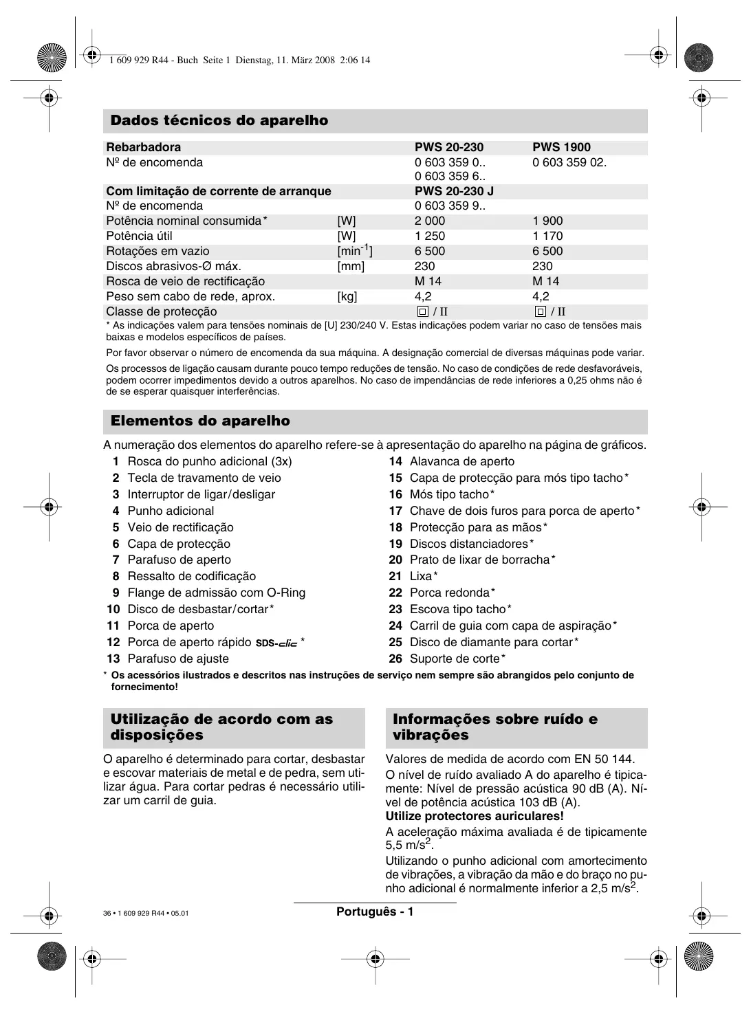 - Os acessórios ilustrados e descritos nas instruções de serviço nem sempre são abrangidos pelo conjunto de fornecimento! Utilização de acordo com as disposições Informações sobre ruído e vibrações O aparelho é determinado para cortar, desbastar e escovar materiais de metal e de pedra, sem utilizar água. Para cortar pedras é necessário utilizar um carril de guia. 36 • 1 609 929 R44 • 05.01 Valores de medida de acordo com EN 50 144. O nível de ruído avaliado A do aparelho é tipicamente: Nível de pressão acústica 90 dB (A). Nível de potência acústica 103 dB (A). Utilize protectores auriculares! A aceleração máxima avaliada é de tipicamente 5,5 m/s2. Utilizando o punho adicional com amortecimento de vibrações, a vibração da mão e do braço no punho adicional é normalmente inferior a 2,5 m/s2. Português - 1 1 609 929 R44 - Buch Seite 2 Dienstag, 11. März 2008 2:06 14 Para sua segurança Um trabalho seguro com o aparelho só é possível após ter lido completamente as instruções de serviço e as indicações de segurança e após observar rigorosamente as indicações nelas contidas. Adicionalmente deverá seguir as indicações gerais de segurança que se encontram no caderno em anexo. Uma instrução prática é vantajosa. ■ Usar óculos de protecção e protecção para os ouvidos. ■ Para a sua segurança, use também outros utensílios de segurança pessoal, como por exemplo luvas de protecção, sapatos firmes e robustos, capacete e avental. ■ Durante o trabalho são produzidos pós que podem ser nocivos à saúde, inflamáveis ou explosivos. São necessárias medidas de protecção adequadas. Por exemplo: Alguns pós são considerados cancerígenos. Utilize uma apropriada aspiração de pó/aparas e use uma máscara de protecção contra pó. ■ Pó de metal leve pode queimar ou explodir. Sempre manter o local de trabalho limpo, pois misturas de material são extremamente perigosas. ■ Caso o cabo de rede for danificado ou cortado durante o trabalho, não toque no cabo. Tire imediatamente a ficha da tomada. Jamais utilizar o aparelho com um cabo danificado. ■ Aparelhos utilizados ao ar livre devem ser conectados através de um interruptor de protecção contra corrente residual com uma corrente de activação de no máximo 30 mA. Não utilizar o aparelho na chuve ou em ambientes húmidos. ■ Ao trabalhar com o aparelho, segure-o sempre com ambas as mãos e mantenha uma posição firme. ■ Fixar a peça a ser trabalhada. Uma peça a ser trabalhada fixa através de dispositivos de fixação ou torno de bancada está mais fixo do que quando segurado com a mão. ■ Conduzir o cabo sempre por detrás da máquina. ■ Sempre desligar o aparelho antes de depositá-la e aguardar até que o aparelho páre completamente. 37 • 1 609 929 R44 • 05.01 ■ No caso de falha de corrente ou se fôr puxada a tomada de corrente, deverá destravar imediatamente o interruptor de ligar/desligar e colocar na posição desligada. Isto evita um novo arranque involuntário. ■ O aparelho só deve ser utilizado para cortes a seco/polimento a seco. ■ O punho adicional deve ser montado durante todos os trabalhos com o aparelho. ■ Apenas segurar a ferramenta eléctrica pelas superfícies de manuseio isoladas, caso a ferramenta de utilização possa entrar em contacto com uma tubulação escondida no muramento ou o próprio cabo eléctrico. O contacto com um cabo que conduz tensão eléctrica, colocará sob tensão as partes de metal expostas da ferramenta e pode levar a um choque eléctrico. ■ Utilize aparelhos detectores apropriados para detectar cabos de alimentação ou peça apoio da sua firma de abastecimento. O contacto com cabos eléctricos pode provocar incêndio e choque eléctrico. O dano de uma linha de gás pode levar a uma explosão. Uma perfuração de um tubo de água provoca um dano material ou pode provocar um choque eléctrico. ■ Para trabalhos com discos de lixar ou de corte é necessário que a capa de protecção 6 esteja montada. Para trabalhos com o prato de lixar de borracha 20 ou com a escova em forma de tacho 23/escova em forma de disco/disco abrasivo em forma de leque, é necessário montar a protecção para as mãos 18 (acessório). ■ Use uma aspiração a vácuo para pó de pedras ao trabalhar com as tais. O aspirador de pó deve ser aprovado para aspirar pó de pedras. Usar um carril de guia para cortar pedras. ■ Materiais que contém amianto não devem ser trabalhados. ■ Apenas utilize ferramentas abrasivas, com um número de rotações admissível que seja no mínimo tão alto como o número de rotações em vazio do aparelho. ■ Controlar as ferramentas abrasivas antes da utilização. A ferramenta abrasiva deve estar perfeitamente montada e deve poder girar livremente. Realizar um funcionamento de ensaio sem carga, durante no mínimo 30 segundos. Ferramentas abrasivas danificadas, descentradas ou vibrantes não devem ser utilizadas. Português - 2 1 609 929 R44 - Buch Seite 3 Dienstag, 11. März 2008 2:06 14 ■ Proteger as ferramentas abrasivas contra golpes, trepidações e gordura. ■ Só contactar a peça a ser trabalhada quando o aparelho já estiver ligado. ■ Não toque nas ferramentas abrasivas em rotação. ■ Observar o sentido de rotação. Sempre segurar o aparelho de forma que faíscas ou pó de lixar voem para longe do corpo. ■ Ao lixar metais voam faíscas. Observe que nenhuma pessoa corra perigo. Devido ao perigo de incêndio, não devem encontra-se materiais inflamáveis nas proximidades (área de vôo de faíscas). ■ Cuidado ao abrir cavidades p. ex. em paredes portantes: Veja as indicações sobre a estática. ■ O aparelho reage com movimentos bruscos, quando o disco de corte é bloqueado. Neste caso o aparelho deve ser desligado imediatamente. ■ Observar as dimensões dos discos abrasivos. O diâmetro do furo deve ajustar-se sem folga à flange de admissão 9. Não utilizar 