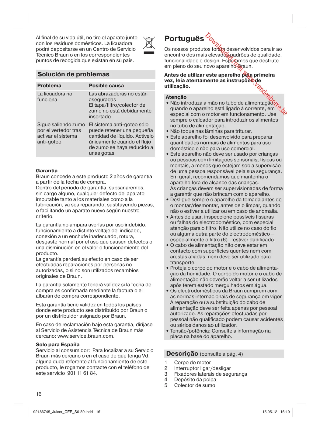 Garantia Os nossos produtos dispõem de uma garantia de 2 anos a partir da data de compra. Qualquer defeito do aparelho imputável, quer aos materiais, quer ao fabrico, que torne necessário reparar, substituir peças ou trocar de aparelho dentro de período de garantia não terá custos adicionais. A garantia não cobre avarias por utilização indevida, funcionamento a voltagem diferente da indicada, ligação a uma tomada de corrente eléctrica incorrecta, ruptura, desgaste normal por utilização que causem defeitos ou diminuição da qualidade de funcionamento do produto. A garantia perderá o seu efeito no caso de serem efectuadas reparações por pessoas não autorizadas ou se não forem utilizados acessórios originais Braun. A garantia só é válida se a data de compra for confirmada pela apresentação da factura ou documento de compra correspondente. Esta garantia é válida para todos os países onde este produto seja distribuído pela Braun ou por um distribuidor Braun autorizado.