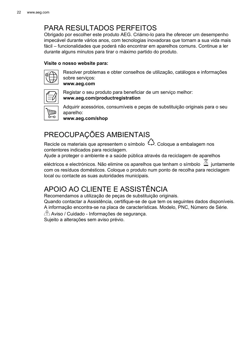 Enregistrer votre produit pour obtenir un meilleur service : www.aeg.com/productregistration Acheter des accessoires, consommables et pièces de rechange d’origine pour votre appareil : www.aeg.com/shop