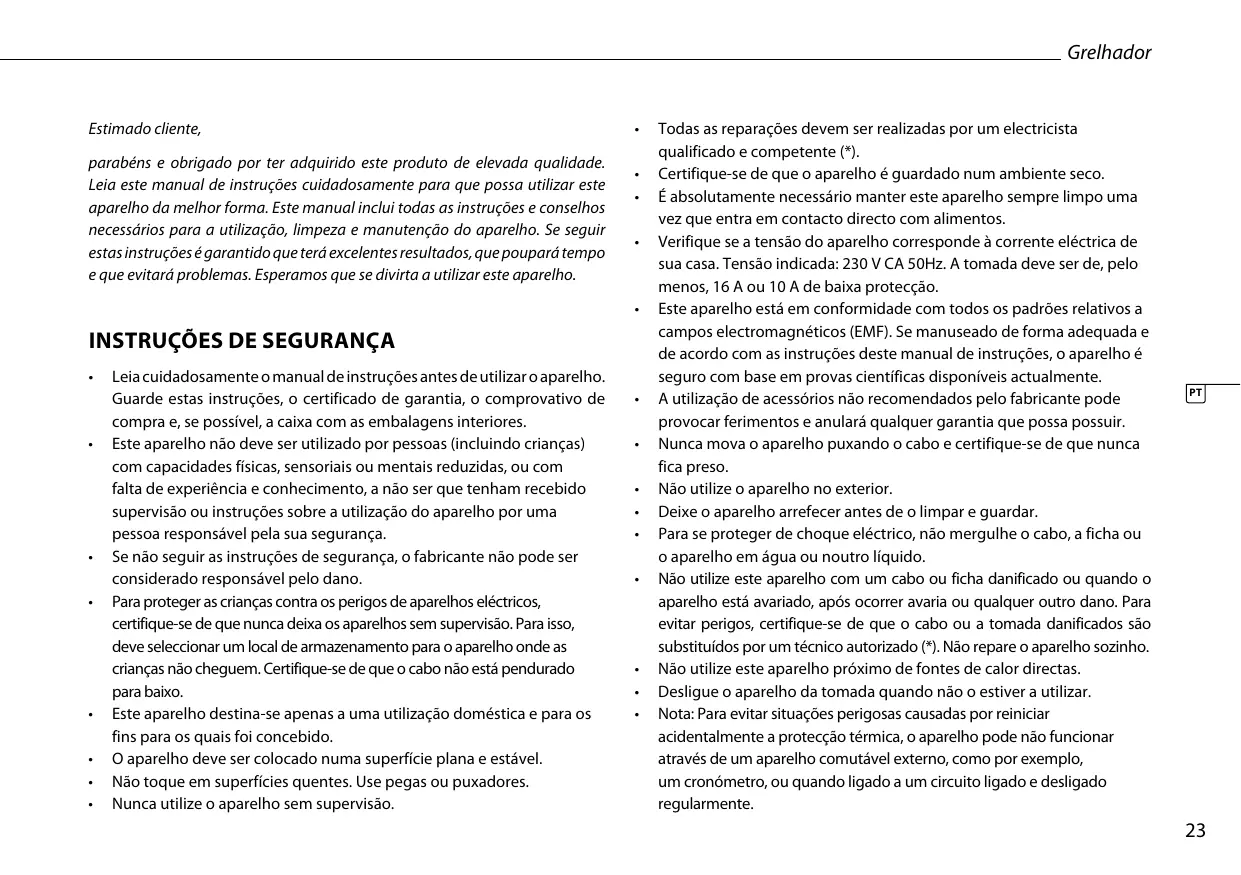 Todas as reparações devem ser realizadas por um electricista qualificado e competente (*). Certifique-se de que o aparelho é guardado num ambiente seco. É absolutamente necessário manter este aparelho sempre limpo uma vez que entra em contacto directo com alimentos. Verifique se a tensão do aparelho corresponde à corrente eléctrica de sua casa. Tensão indicada: 230 V CA 50Hz. A tomada deve ser de, pelo menos, 16 A ou 10 A de baixa protecção. Este aparelho está em conformidade com todos os padrões relativos a campos electromagnéticos (EMF). Se manuseado de forma adequada e de acordo com as instruções deste manual de instruções, o aparelho é seguro com base em provas científicas disponíveis actualmente. A utilização de acessórios não recomendados pelo fabricante pode provocar ferimentos e anulará qualquer garantia que possa possuir. Nunca mova o aparelho puxando o cabo e certifique-se de que nunca fica preso. Não utilize o aparelho no exterior. Deixe o aparelho arrefecer antes de o limpar e guardar. Para se proteger de choque eléctrico, não mergulhe o cabo, a ficha ou o aparelho em água ou noutro líquido. Não utilize este aparelho com um cabo ou ficha danificado ou quando o aparelho está avariado, após ocorrer avaria ou qualquer outro dano. Para evitar perigos, certifique-se de que o cabo ou a tomada danificados são substituídos por um técnico autorizado (*). Não repare o aparelho sozinho. Não utilize este aparelho próximo de fontes de calor directas. Desligue o aparelho da tomada quando não o estiver a utilizar. Nota: Para evitar situações perigosas causadas por reiniciar acidentalmente a protecção térmica, o aparelho pode não funcionar através de um aparelho comutável externo, como por exemplo, um cronómetro, ou quando ligado a um circuito ligado e desligado regularmente.