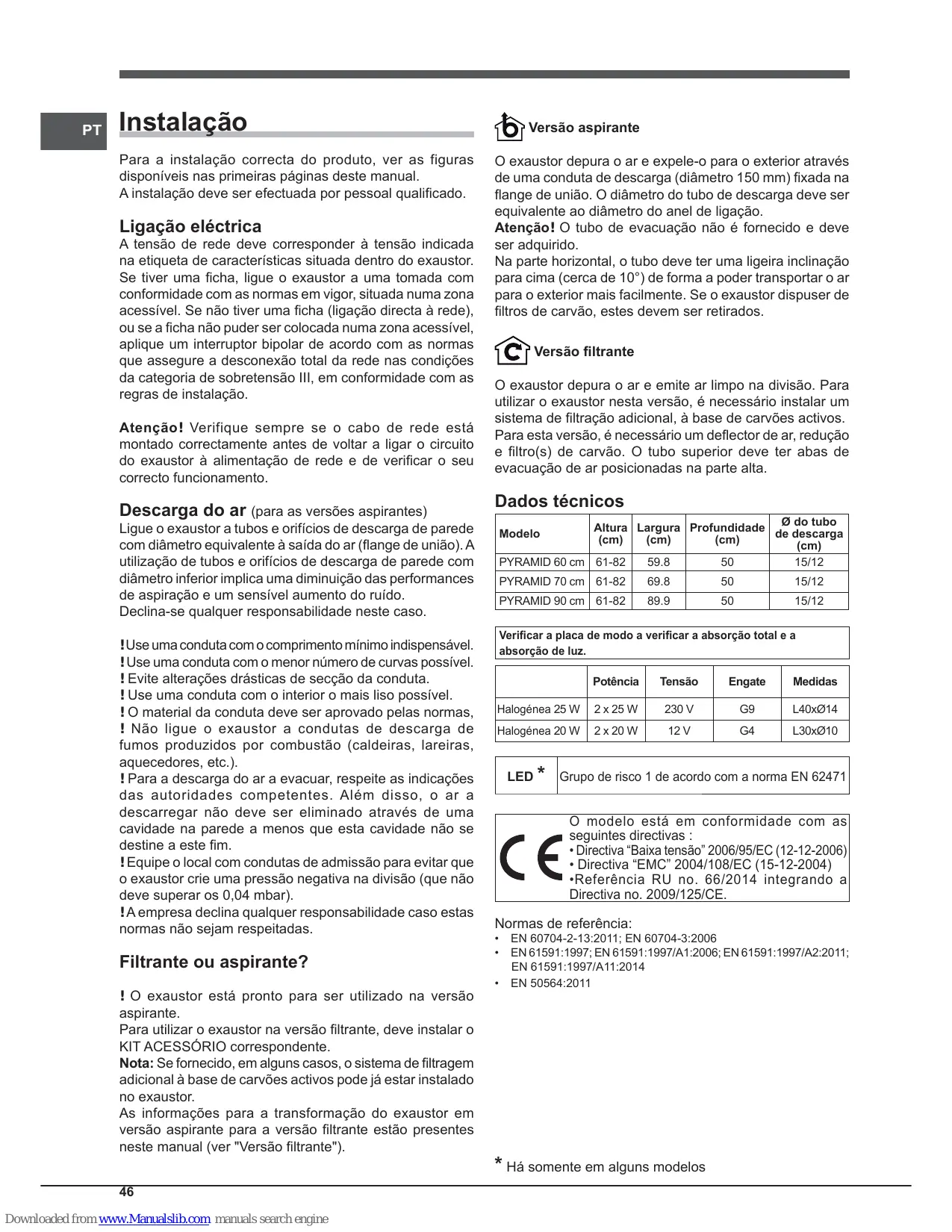 Advertências ! É importante guardar este manual para poder consultá-lo a qualquer momento. Em caso de venda, cessão ou transferência, assegure-se de que este permanece junto com o produto. ! Leia atentamente as instruções: contêm informações importantes sobre a instalação, o uso e a segurança. ! Não efectue alterações eléctricas ou mecânicas no produto ou nas condutas de descarga. Segurança geral • A distância mínima entre a superfície de suporte dos recipientes no dispositivo de cozedura e a parte mais baixa do exaustor de cozinha não deve ser inferior a: 65 cm se o exaustor for instalado sobre uma placa de cozedura a gás 55 cm se o exaustor for instalado sobre uma placa de cozedura eléctrica. Se as instruções de instalação do dispositivo de cozedura a gás especificam um distância maior, é necessário considerá-la. • O exaustor dispõe de buchas de fixação adequadas à maioria das paredes/ tectos. Ainda assim, é necessário contactar um técnico qualificado para assegurar a idoneidade dos materiais consoante