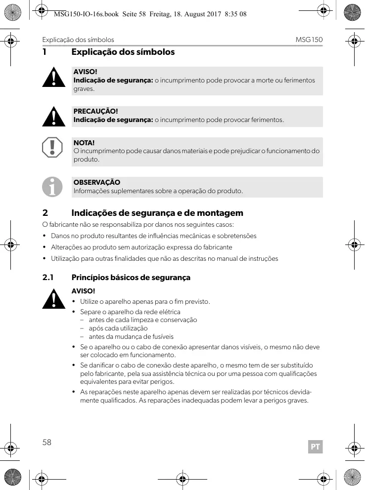 MSG150 Por favor, leia atentamente este manual antes da montagem e colocação em funcionamento do aparelho e guarde-o em local seguro. Em caso de transmissão do produto, entregue o manual ao novo utilizador.