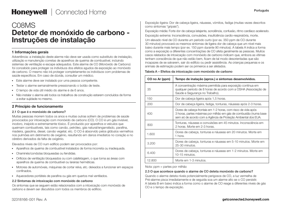 Encontre gratuitamente o manual do aparelho CO8MS HONEYWELL em formato PDF.