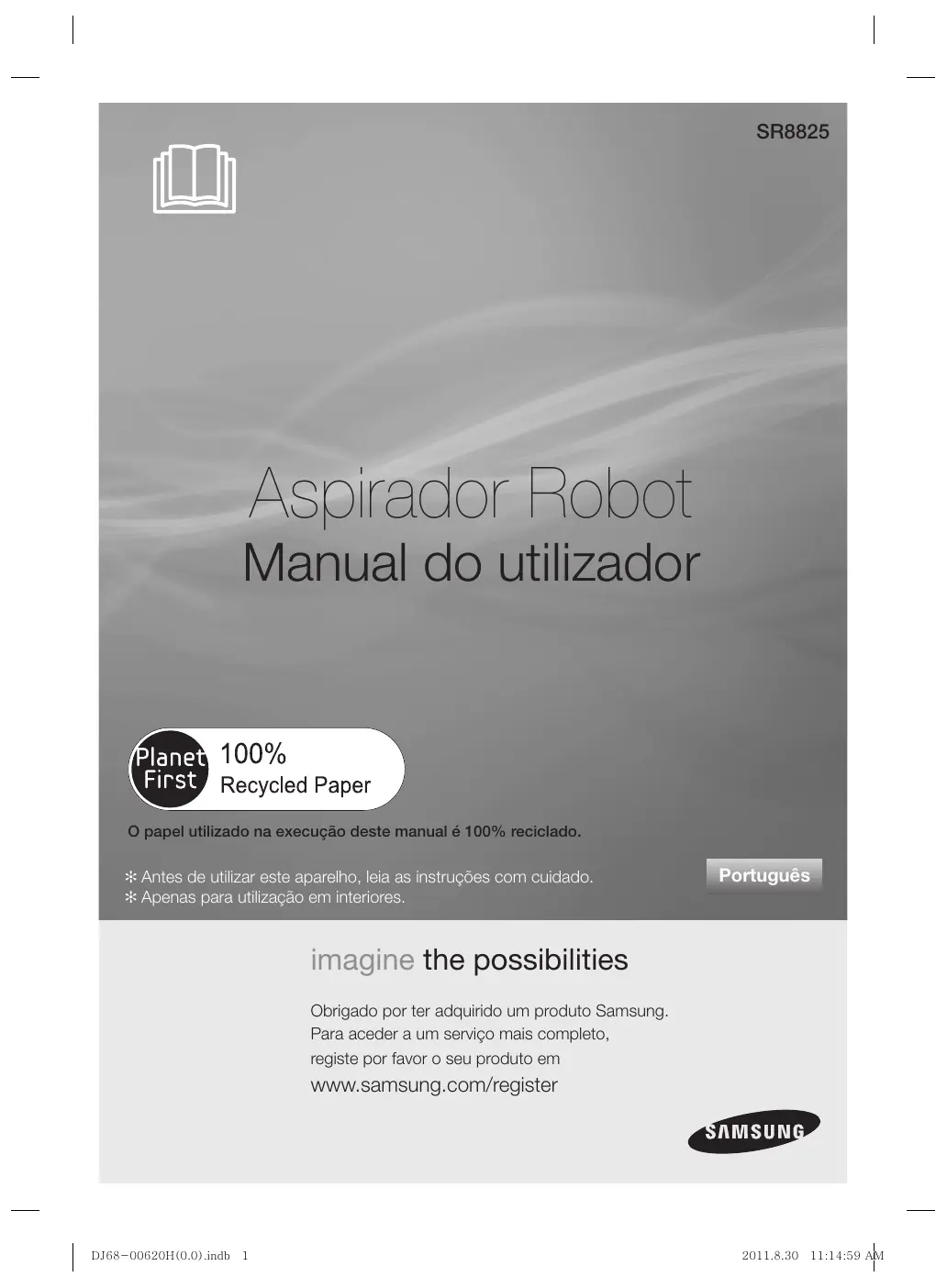 Especificaciones mecánicas ELEMENTO El aspirador cuenta con la aprobación de las siguientes normativas. Directiva de equipos electromagnéticos: 2004/108/EEC Directiva de seguridad de bajo voltaje: 2006/95/EC Especificaciones del producto _39 DJ68-00620H(0.0).indb 섹션5:39 2011.8.30 11:14:58 AM DJ68-00620H(0.0).indb 섹션5:40 2011.8.30 11:14:59 AM SR8825 Aspirador Robot Manual do utilizador O papel utilizado na execução deste manual é 100% reciclado. ✻ Antes de utilizar este aparelho, leia as instruções com cuidado. ✻ Apenas para utilização em interiores. Português imagine the possibilities Obrigado por ter adquirido um produto Samsung. Para aceder a um serviço mais completo, registe por favor o seu produto em www.samsung.com/register DJ68-00620H(0.0).indb 1 2011.8.30 11:14:59 AM Informações de segurança