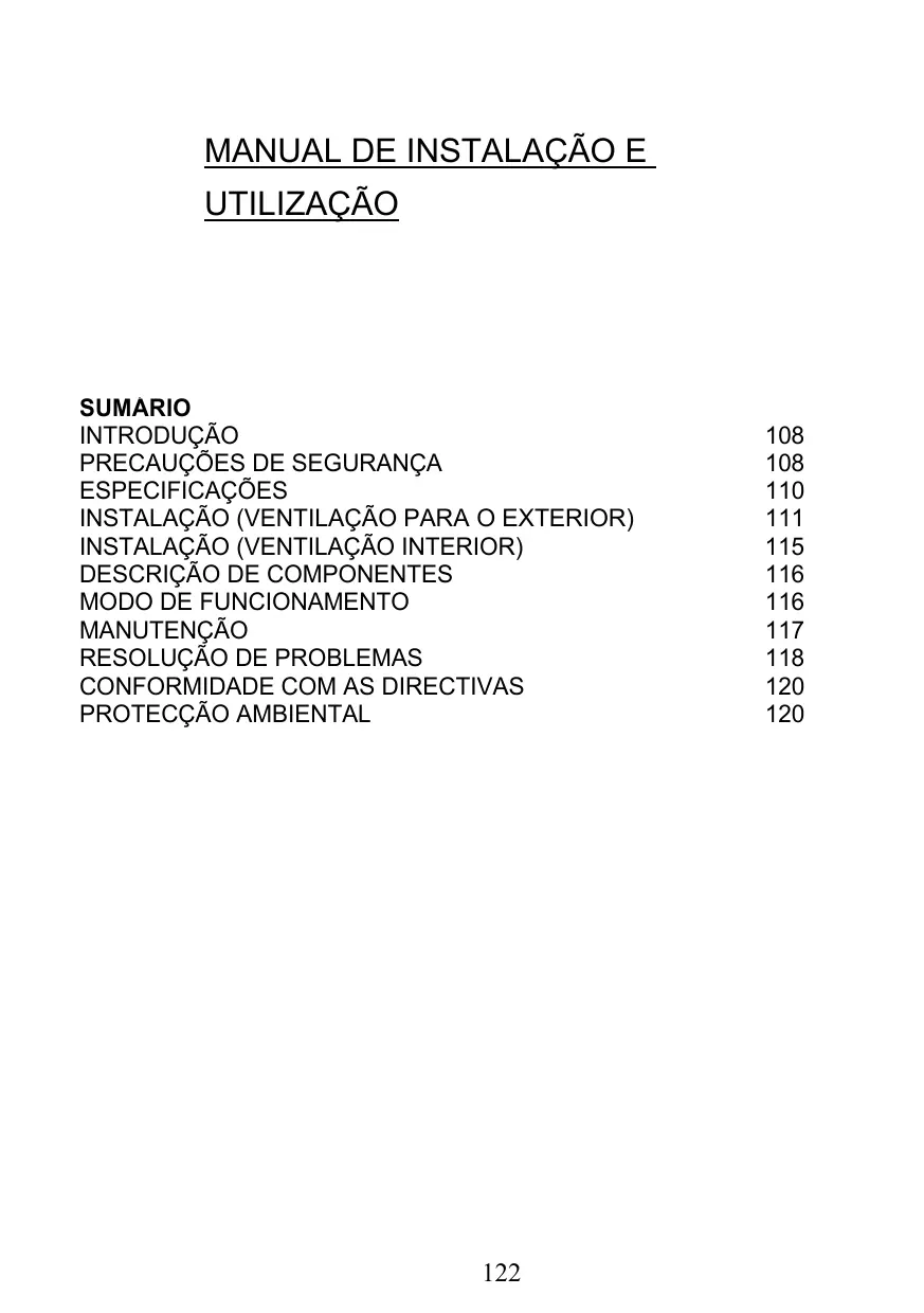 ESPECIFICAÇÕES INSTALAÇÃO (VENTILAÇÃO PARA O EXTERIOR) INSTALAÇÃO (VENTILAÇÃO INTERIOR)