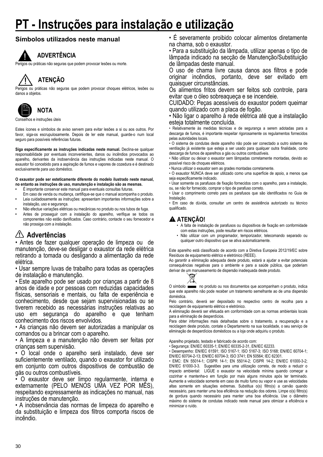 • Les enfants ne doivent pas jouer avec l’appareil. • Le nettoyage et l’entretien par l’usager ne doivent pas être effectués par des enfants sans surveillance. • La pièce doit avoir une aération suffisante lorsque la hotte est utilisée conjointement avec d'autres appareils fonctionnant au gaz ou autres combustibles. • La hotte doit être régulièrement nettoyée à la fois à l'intérieur et à l'extérieur (AU MOINS UNE FOIS PAR MOIS); cela devrait se faire en conformité avec les instructions d'entretien. Le non respect des instructions